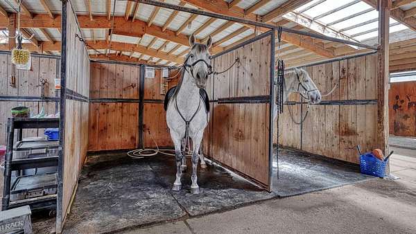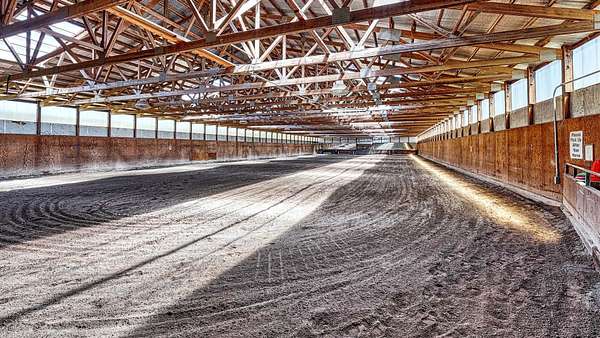 Horse Arena and Indoor Stall Barn - 27,000 sf under roof, heated, insulated 80' x 210' indoor area with excellent footing. 44 matted stalls with automatic waters and corner tack lockers in each stall. Wash racks with hot water, veterinary stall and shoeing areas. In the center of the barn is the Managers Office, two restrooms and a cafe/lobby/viewing room. A nice patio area adjacent to the stalls, arena and lobby area compliments the comfortable main facility.