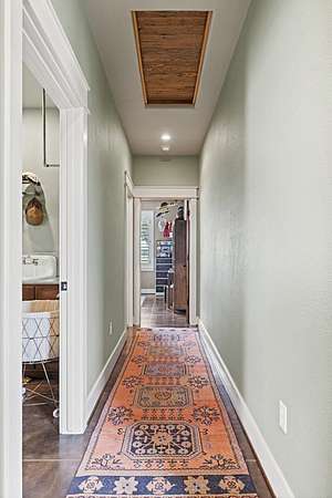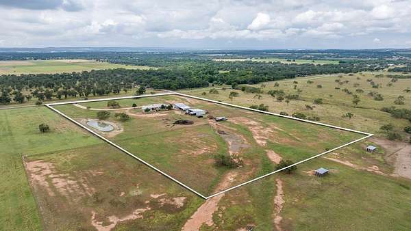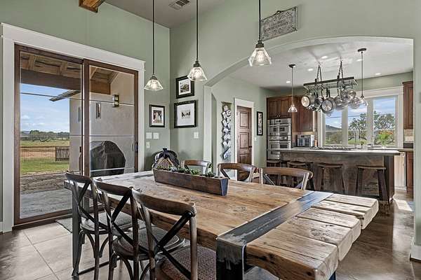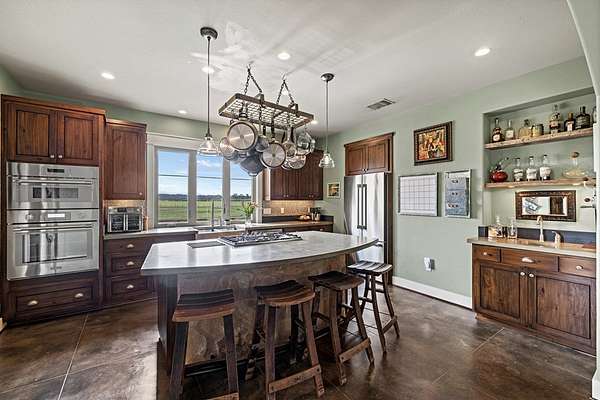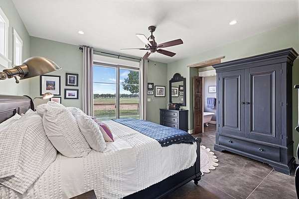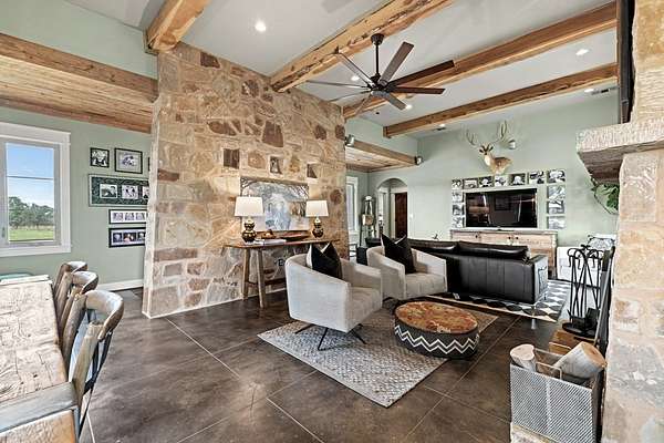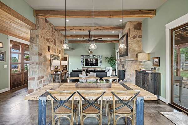 Pastoral views of the surrounding Hill Country set the scene for this 13.25-acre property, just minutes from Fredericksburg's Main Street and wineries. This 2,315 sq ft, 3-bedroom, 3.5 bathroom home, built in 2009 by Richard Laughlin, offers a blend of rustic charm and modern amenities. Inside, a rock accent wall, stained concrete floors, and natural light create a welcoming atmosphere. The kitchen boasts Thermador appliances, custom cabinetry, concrete countertops, and a rugged island. Outside, a stone patio with an outdoor fireplace is perfect for relaxation. The property includes a modern 60x40 Mueller metal steel barn with a custom welded pen system and covered livestock working pens, suitable for cattle and equine use. It also features a rainwater collection system and an enclosed insulated feed/tack room. Additionally, there's a charming casita with a full bathroom connected to the carport and workshop, providing extra living space or guest accommodations. With three lush grass pastures, a stock pond, and space for livestock, this property is ideal for Hill Country ranching. Don't miss this opportunity to own a well-equipped Texas property.