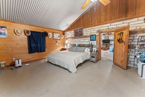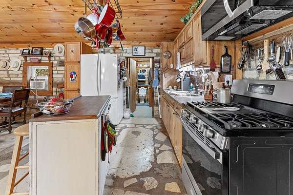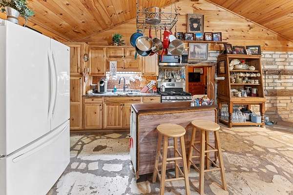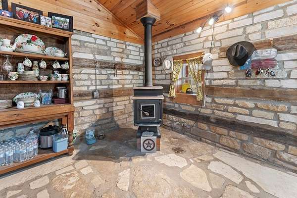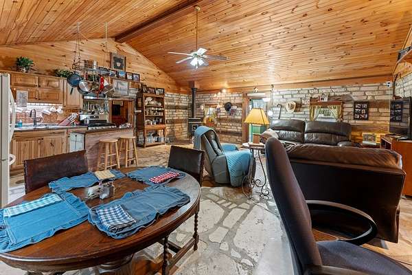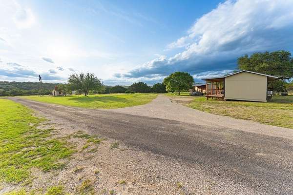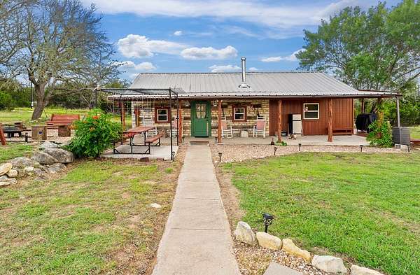 Tucked away just a mile down the road from the legendary Luckenbach, Texas, this scenic 8-acre property offers the perfect blend of rustic charm and modern convenience. The main home, built of stone and timber, features one oversized bedroom, two full bathrooms, and a spacious open-concept living and kitchen area-ideal for entertaining or simply soaking in the serene surroundings. Take in sweeping Hill Country views and stunning sunsets from both the front and back porches. Two charming guest cabins-currently leased month-to-month-provide immediate rental income potential or space for guests. A large barn offers ample storage, complemented by a two-car carport and a beautifully crafted stone tank house that serves as a utility room. Fully perimeter-fenced and surrounded by rolling hills, this property is a rare opportunity to own your own slice of Texas tranquility, with the music and magic of Luckenbach just down the road.