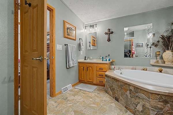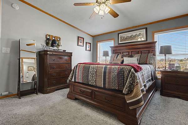 - Ceiling Fans, Garden Tub Roman Tub, Laminate Counters, Main Level Primary, Pantry, Walk In Closets, Walk In Shower, Window Treatments