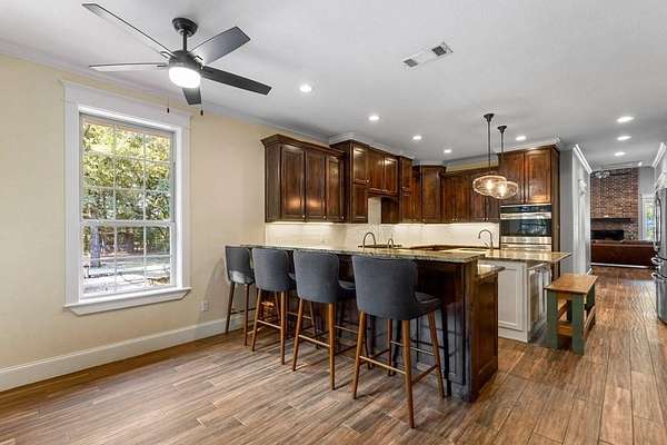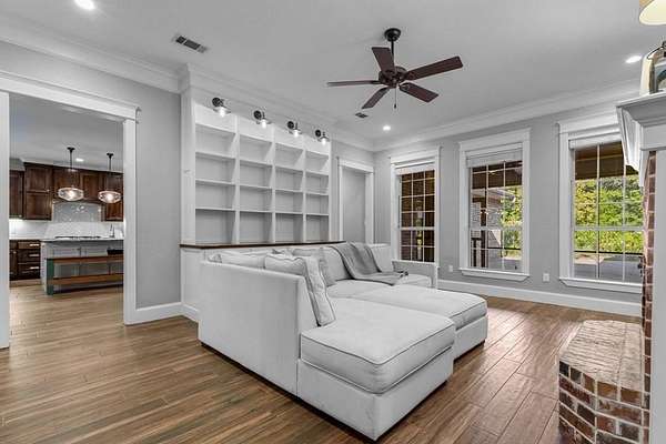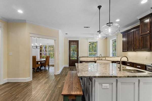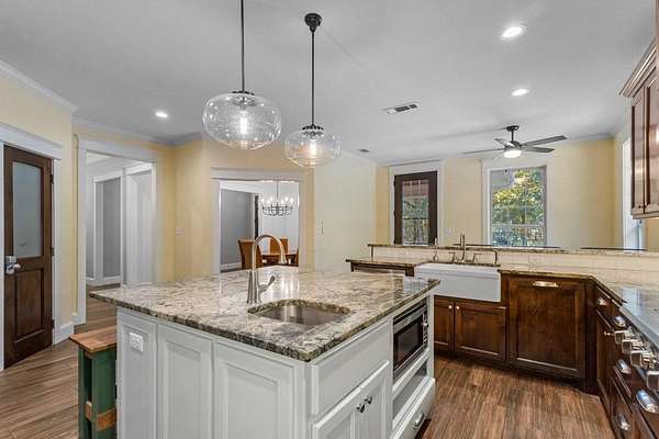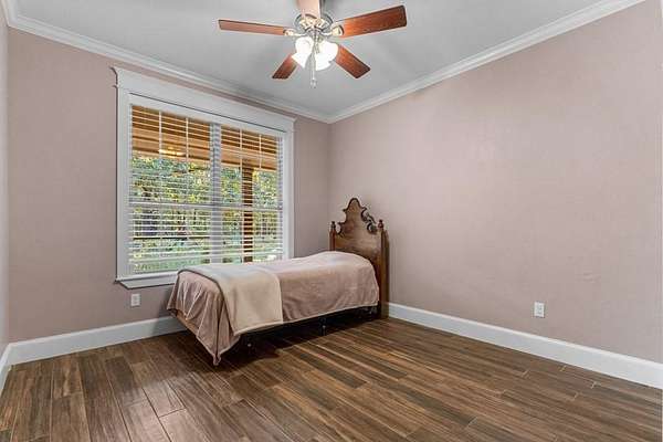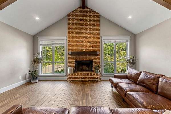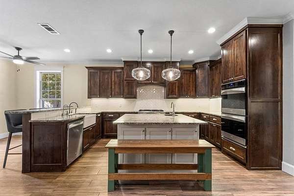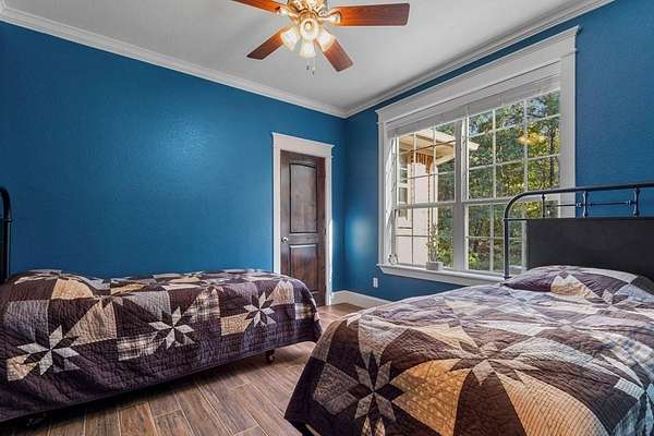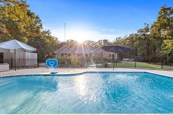 Welcome to your dream property—where exceptional design meets functionality, nestled on an expansive 22.48-acre estate. This custom 3,148 square foot, 4-bedroom, 2.5-bath home is packed with high-end features. The interior boasts soaring ten-foot ceilings, thick crown moldings, and lofty windows. You'll find ceramic wood-look flooring, richly stained knotty alder doors, and thoughtful modern additions like a tankless water heater, spray-foamed attic, automatic walk-in closet lighting, and programmable exterior outlets. The kitchen serves as the heart of the home with its granite countertops, gas range, double convection ovens, a large walk-in pantry, and farmhouse sink. Ample storage and sophisticated touches like an instant hot water dispenser and a prep-sink-equipped island enhance your culinary experience. The primary suite offers more than a retreat—it’s your personal haven. A tray ceiling frames sweeping views, while the ensuite bathroom features a deep soaking tub, a waterfall-head walk-in shower, and pivoting mirrors for added elegance. Gather with family in the library-like family room featuring a built-in bookcase and gas fireplace. Additional bedrooms are perfectly situated to accommodate your needs, making this a home of balance and charm. Step outdoors to unparalleled recreational spaces. Relax in the cedar-framed screened porch or lounge by the fully fenced saltwater pool, complete with a waterslide and spacious decking perfect for entertaining. The adjacent English rose garden and butterfly-filled perennial plants create a natural haven of beauty and serenity. Explore the ag-exempt oak forest complete with a creek, abundant wildlife, and lush fruit trees—ideal for camping, nature-watching, or quiet reflection. A pond and fields dotted with 200-year-old oak trees enhance the pastoral feel, providing opportunities for grazing and spring wildflowers.