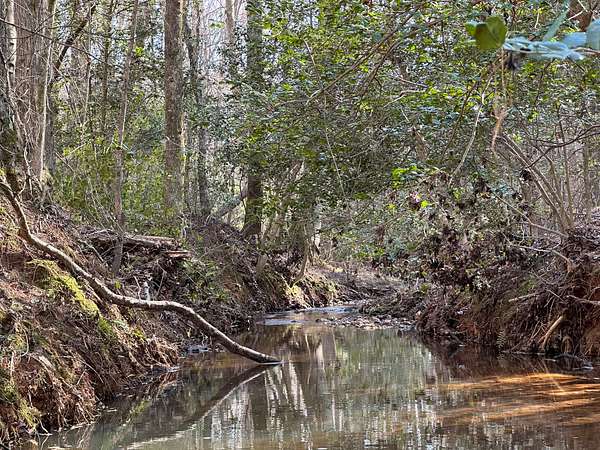 This property offers a high percentage of useful land. Floodplains associated with the streams are narrow, and only the streambeds are designated on national wetlands inventory maps. No FEMA floodplains are designated on the property. A plat prepared in 1980 describes the tract as 100.69 acres. One graveled driveway enters the eastern portion of the tract. There are no structures or other improvements on the land. The property is all wooded with a mix of mature hardwood and planted pine.