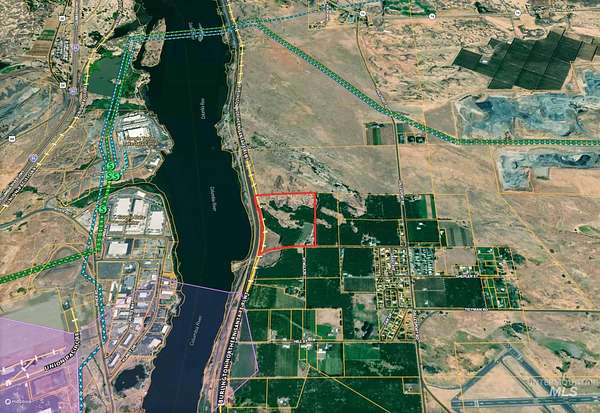 Across from the Google AI Data Center, this property offers panoramic views of the Columbia River with an established orchard. Zoning of R1 may work well for development. Site may also work well for AI data center, technology, or manufacturing use, pending buyer's zoning approval based on specific needs. Price includes the seller's interest in an existing contract of sale for the home, with terms transferring to the buyer at closing. Payments are approx. $1,300 (+/-)/mo., including taxes. 24 years remain on the owner-carry contract. The orchard is leased, with the owner receiving 22% net of the annual crop. (BTVAD)