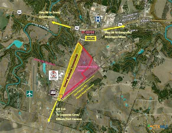 Approximately 116 acres of city-annexed development land in Gatesville, Texas, offering a rare master-planned opportunity positioned for commercial, industrial, mixed-use, logistics, distribution, and employment-driven residential development. Strategically located with frontage and access along Texas FM 116 and Old Pidcoke Road, the property provides excellent visibility, multiple access points, and the ability to separate uses and traffic patterns, making it well suited for anchor retail or service commercial along the frontage with flex, light industrial, logistics, or distribution uses and residential or workforce housing positioned behind. City utilities are available, and the property maintains AG tax status, allowing favorable holding costs during planning, entitlement, and phased development. The site is located directly across from the Gatesville Municipal Airport, providing regional air access for corporate users, contractors, government agencies, defense-adjacent operations, and logistics support. The property is also located near Fort Hood, one of the largest military installations in the United States, driving sustained demand for housing, retail services, logistics, medical, and industrial development. The region benefits from proximity to Central Texas aerospace and advanced manufacturing activity, including SpaceX operations, supporting long-term employment growth tied to military, defense, manufacturing, and transportation sectors. Gatesville offers a business-friendly environment, low crime rate, stable workforce, and favorable tax climate, with convenient access to Waco, Temple, and Killeen and reasonable drive times to Austin, Dallas-Fort Worth, and Houston. This tract supports phased or multi-user development, campus-style projects, or master-planned mixed-use concepts with multiple exit strategies and long-term upside in a growing Central Texas corridor.