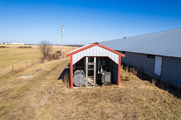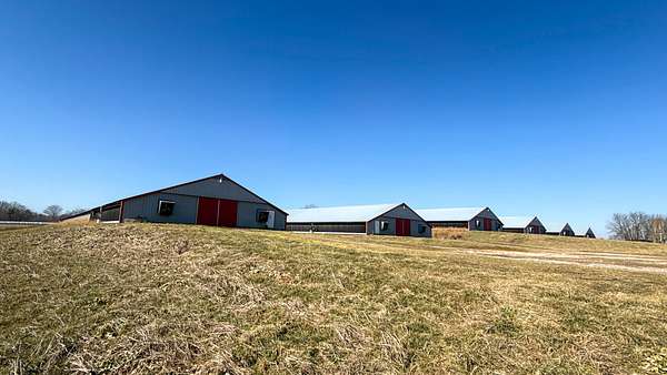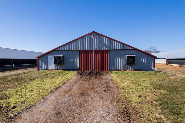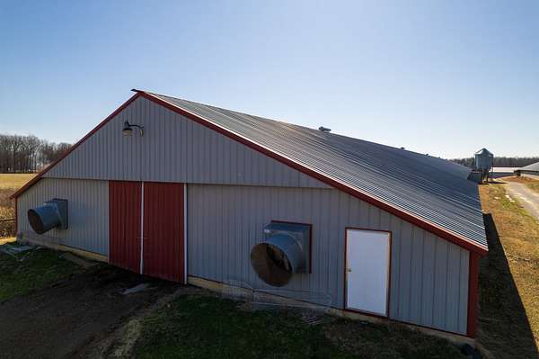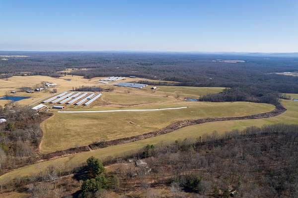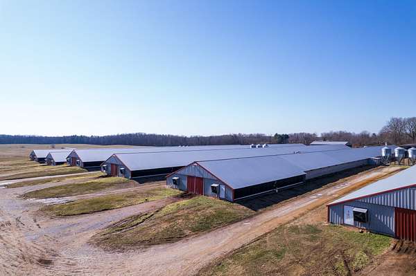 Infrastructure includes natural gas service, both well and city water, compost mortality management, and two litter sheds. A farm office/apartment provides flexibility for a primary residence or employee housing, and a large pond adds both function and appeal.