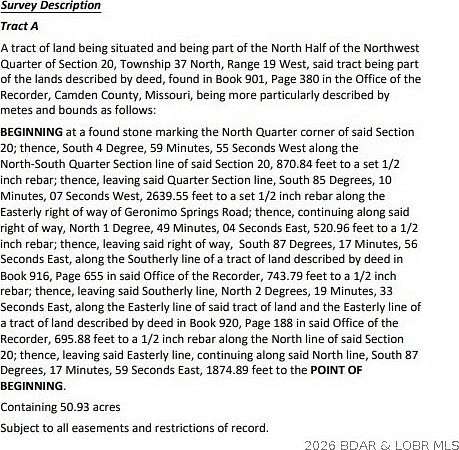 50.93 Acres of Ozark Adventure in Camden County, MO! Escape the ordinary and claim your slice of the Missouri Ozarks! This remarkable 50.93-acre property stretches a full half-mile back off a Geronimo Springs, offering unmatched privacy and endless possibilities. Whether you're dreaming of building your forever home or a weekend getaway, two scenic ridge tops sit waiting in the back of the property - perfect elevated home sites with stunning natural views. Outdoor enthusiasts, this one's for you! The land is loaded with whitetail deer and turkey, making it a hunter's paradise from opening day through season's end. Miles of natural terrain are ready for trail riding, ATV adventures, and year-round recreation right out your back door. Towering big oak timber adds beauty, value, and incredible natural character throughout the property. Private. Secluded. Loaded with potential. Whether you're hunting, riding, building, or simply unplugging - this Camden County gem checks every box. Properties like this don't last. Come walk it and fall in love!