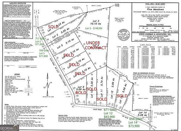 Looking for a little land in Forsyth? Here's some! Check out Lot 3 - a 10.10 +/- Acre Lot Ready for Your Future Home in Beautiful Forsyth, GA (Monroe County)! Welcome to Pine Meadows - a small development acreage lots in Forsyth where you're next dreams can unfold. Served by a private gravel drive, this estate lot is begging to be your future homesite. Recent survey and level one soil analysis available - soils tested suitable for a conventional septic system. The homesite area has some trees, but is not dense in woods, so clearing the homesite will be a breeze. The neighboring lot(s) are also for sale. Purchase multiple lots for a larger acreage parcel or bring a friend or family member and live side by side, if desired. High speed internet is available! Giles road is a very quiet and paved rural road with little traffic. I-75 is just 15 minutes away - making this the ideal location for those seeking the peace and quiet of a rural feel, yet the convenience of the interstate nearby. Visit the quaint downtown Forsyth square, where there are many great local small businesses, coffee shop, and restaurants and many local community events are held. Gas, grocery, shopping and dining are all less than 15 minutes away as well. Sought after Monroe County school system. Visit nearby Lake Juliette (approx 20-30 min away) for recreation and fishing in your spare time. Land financing is available through AG South with as little as 15% down or call your local bank. Will require well and septic. No modular/mobile homes - stick built only. Please see restrictive covenants.