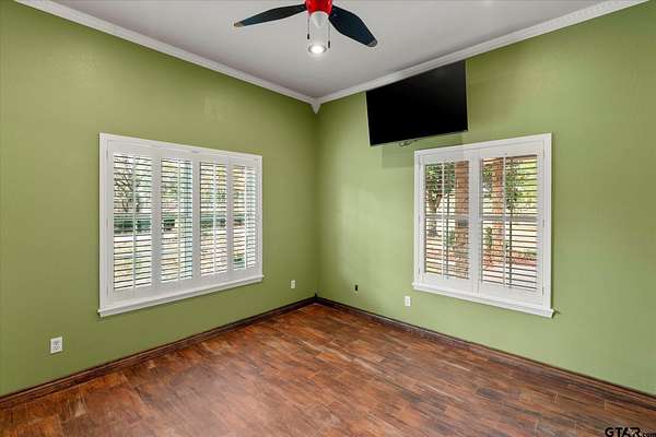 - Blinds, Ceiling Fan, Plantation Shutters, Vaulted Ceilings