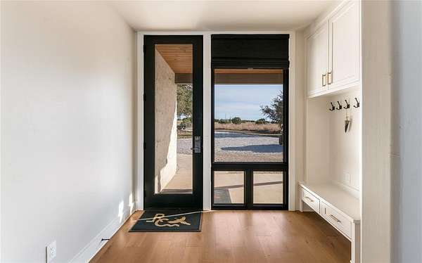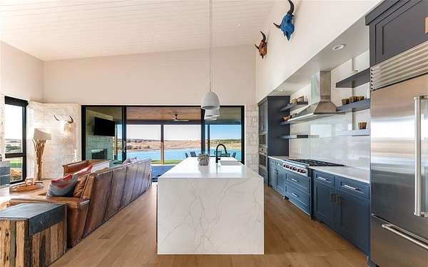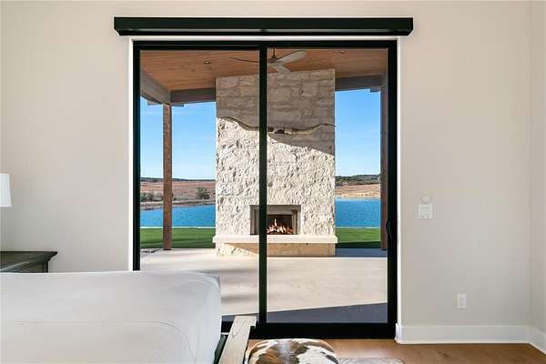The 2,907-square-foot residence overlooks its own private lake, with the back porch perfectly positioned to capture tranquil water views and long vistas toward Gun Mountain. Designed with a refined modern Hill Country style, the home features clean lines, natural materials, and generous windows that frame the surrounding landscape and bring the outdoors in.