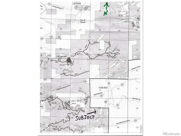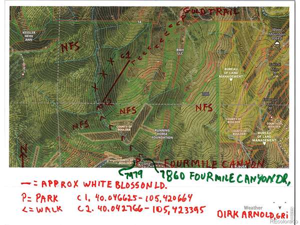 Boulder West on Mapleton Ave for 5.6 miles, bear left at Y. go 3.8 miles to Gold Hill settlement, turn immediately First left when entering town to go on Gold Run Rd for 7/10 miles to Dixon, turn R. W, then go 6/10th to Gold Trail, turn L. go 1/10 mile, PARK in cul-de-sac. Call listing agent and/or see documents in MLS IRES Documents for maps & details to the site. Must WALK TO SITE only. Please do not disturb the residents. Call for a map or get one from your realtor, they're free!