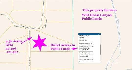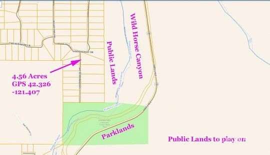 Est $183/moVery nice large 4.56 acres. This parcel is nicely situated, offers spectacular views, and several ideal homesites, captures the sunshine for possible solar energy if desired, and boasts numerous trees and native shrubbery.There is a driveway cut in, and this one is inside the subdivision far enough that you are afforded plenty of seclusion, privacy, and personal space. Great location for a homesite or campsite. Located in Bonanza, Oregon " KFFE, Block 19, Lot 30, where Golden Eagle Drive crosses Chicken Hawk Lane.