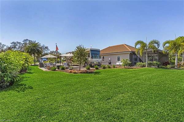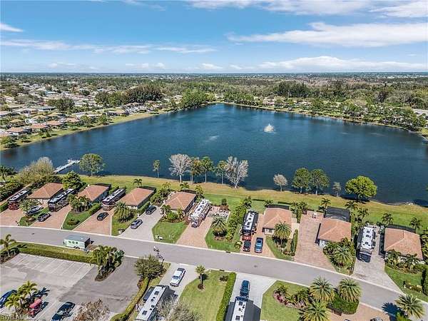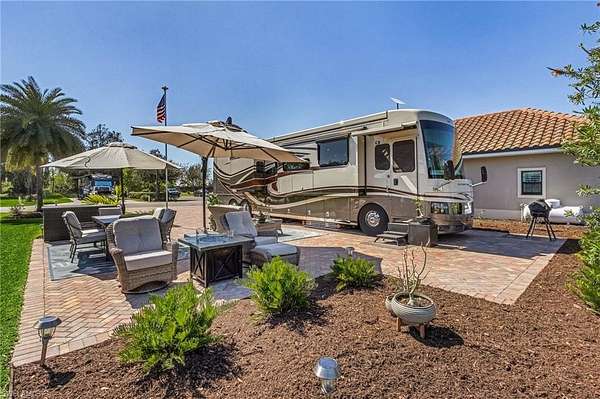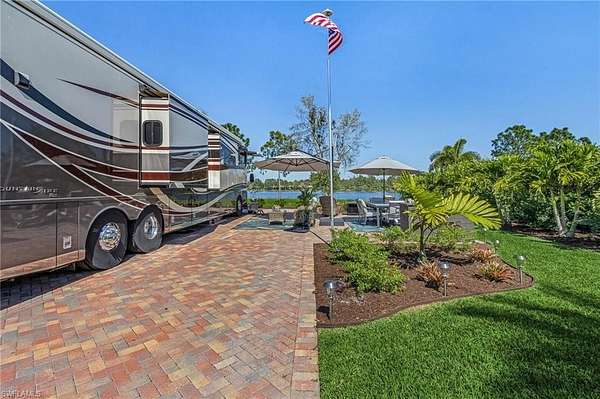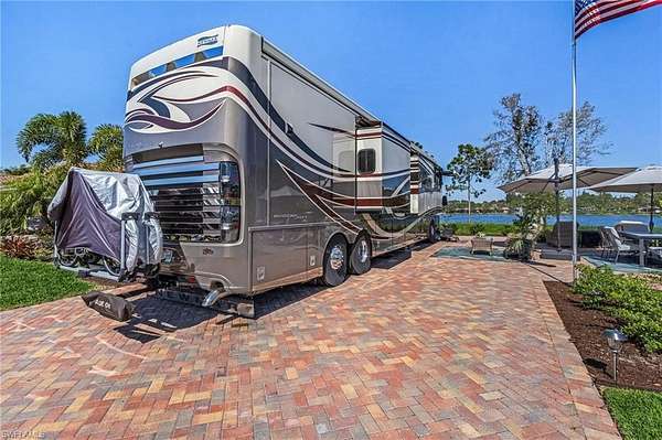 Welcome to Golden Palms Luxury Motorcoach Resort, Southwest Florida's most sought-after luxury motorcoach resort. This exceptional oversized lakefront lot offers a highly desirable north-facing orientation with stunning direct views of the illuminated fountain, creating a picturesque setting both day and night. Ideally positioned just steps from the clubhouse and resort amenities, the property features an expansive 55' x 110' layout with an extended 23' x 85' brick paver RV pad, a marine-grade utility pedestal, and an adjoining 14' x 27' patio-perfect for outdoor living and entertaining. Lush, mature landscaping enhances both privacy and curb appeal. As one of the few premium lakefront lots without an existing cabana, this property presents a rare opportunity to design and build a custom coach cabana tailored to your vision. Golden Palms offers a 22-acre central lake, resort-style pool and spa, clubhouse with indoor and outdoor kitchen, fitness center, pickleball courts, dog park, and a vibrant social atmosphere, all within close proximity to shopping, dining, Southwest Florida International Airport, and the region's renowned white-sand beaches. Beyond the gates, enjoy the very best of Southwest Florida living with an abundance of vibrant attractions just minutes away. Spend your days soaking up the sun on the region's famous white sugar-sand beaches, including Fort Myers Beach and Sanibel Island, known for their shelling, sunsets, and turquoise waters. Explore premier shopping and dining at Gulf Coast Town Center and Miromar Outlets, or enjoy local favorites like The Saucy Meatball and craft brews at Fort Myers Brewing Company. From waterfront restaurants and live music to farmers markets, boating, and year-round events, this area offers the perfect blend of relaxation and energy-making every day feel like a vacation.