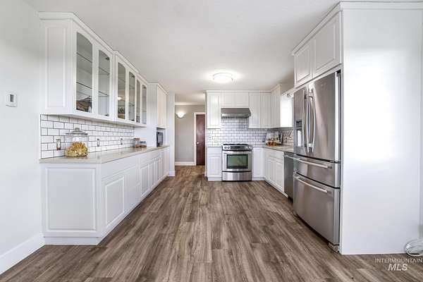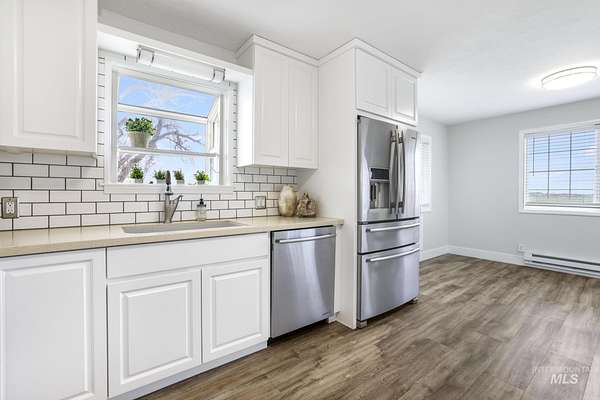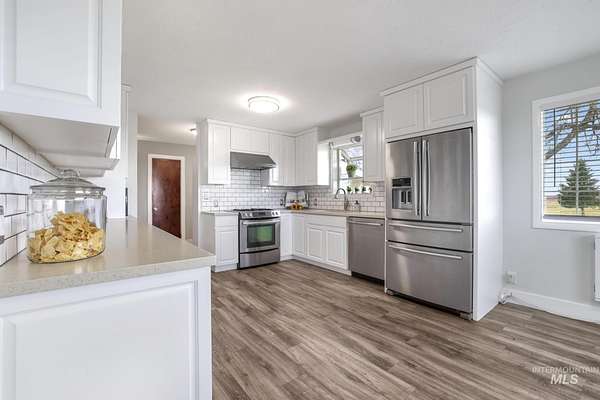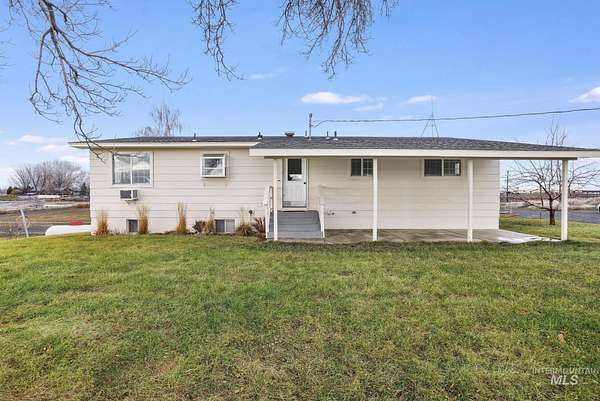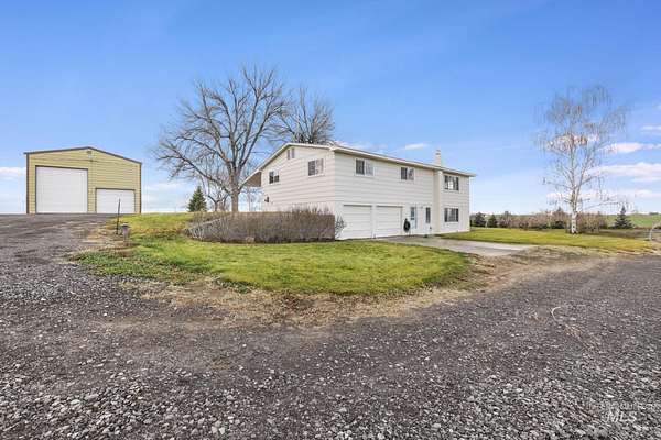 The comforts of country living with the convenience of the city of Gooding just 3 miles to the West. This 4.990 acre parcel features a spacious 2300 sq ft plus home that provides for ground level access to the main floor along with ground level main entry and daylight basement entry. its unique design provides for a 2-car attached garage with access to the daylight basement. Updated flooring, updated kitchen and baths. This property offers a country opportunity with 0ne acre currently in alfalfa with its own wheel line and pressurized main line from the private pond. An extensive manual sprinkler system has been installed to water the yard . Numerous fruit trees are present . Loafing shed and garden area. Two shops top off the list of amenities, one with concrete floors, overhead door, propane heat and home for the solar system that services the home. The solar system is owned. Ingress/egress from the county road is convenient with the improved circular driveway. Ample parking for all your toys, RV's or equipment.