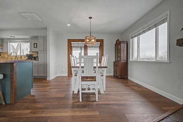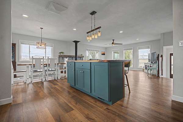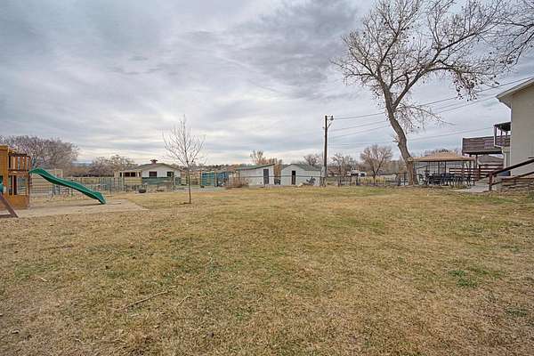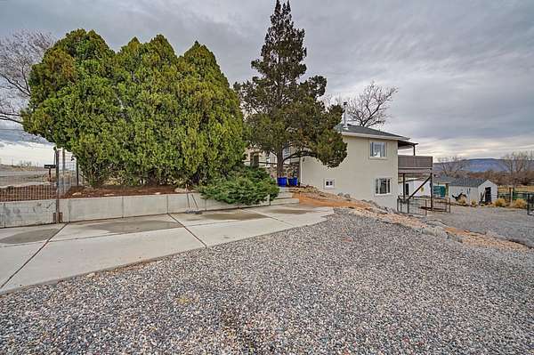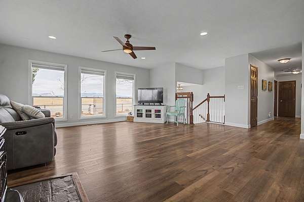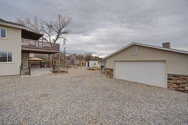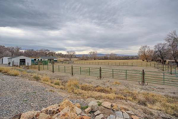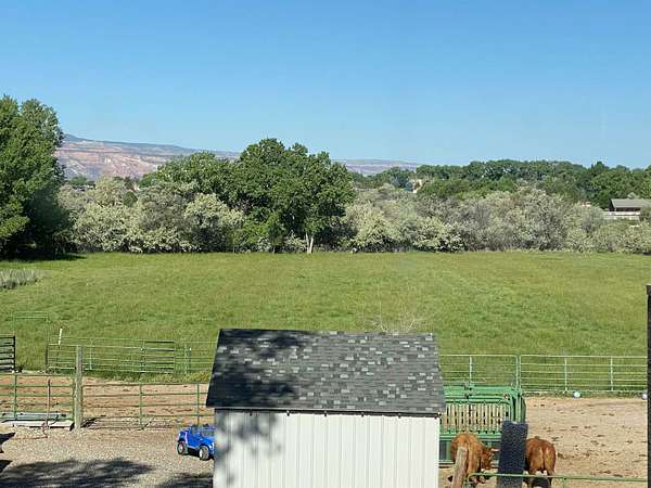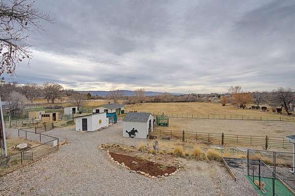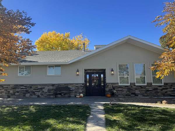 Dreamy home, hobby farm, horse property, with heavenly views - just minutes from town! This turn-key, beautifully remodeled 5-bedroom, 3-bathroom home offers 3,036 SqFt on 5 fully fenced acres with breathtaking valley views and no HOA. Surrounded by agricultural properties, this is peaceful rural living at its finest. Inside, enjoy an open-concept layout with a newly opened kitchen featuring a large island, stainless steel appliances, new flooring, fresh interior paint, and updated exterior stucco with cultured stone accents. A wood-burning fireplace warms the main living area, while a second living space, workroom, and storage room downstairs add flexibility. Step onto the upper deck off the dining room or out the walk-out basement to the lower patio and take in the views. Outside, this hobby farm is fully equipped with a 4-stall barn and tack room with electricity, riding arena with horse shelter & tack house, chicken coop & feedroom with electricity, 3 additional pens with small shelters, garden plot, over 2.5 irrigated pasture acres with 5 shares of irrigation water, apple tree, grape vines, mature landscaping, and a detached 2-car garage. A rare opportunity for acreage, views, and a move-in-ready home close to the city - properties like this don't come up often. Info subject to error - buyer to verify all info.