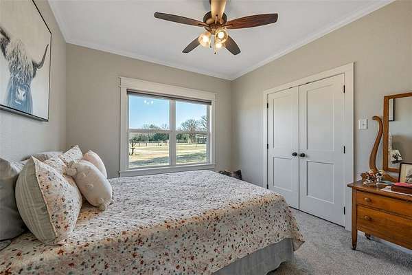 The 1,720 sq. ft., 3-bed, 3-bath climate-controlled home, built in 2017 with a 2020 addition, features spray foam insulation, hardwood plank floors, granite countertops, a deep farm sink, barn door to the laundry, and a wheelchair ramp. A Simplisafe security system and wired smoke detectors add peace of mind. Step outside onto the 400 sq. ft. covered porch to take in the rolling pastures, woods, and stocked ponds.