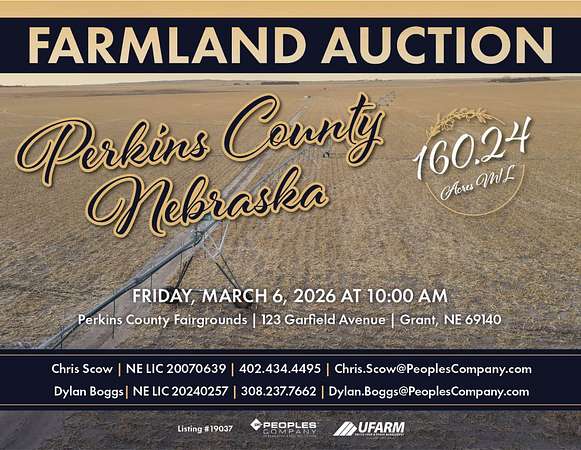 UFARM and Peoples Company are pleased to present 160.24 m/l acres of irrigated Perkins County farmland located in District 2 Township. The property consists of a quarter section under a center pivot irrigation, featuring predominantly well-draining Woodly loamy fine sand soils and gently rolling topography with slopes ranging from 0 to 3 percent. The public auction will be held at Perkins County Fairgrounds in Grant, Nebraska with live and online bidding options available.