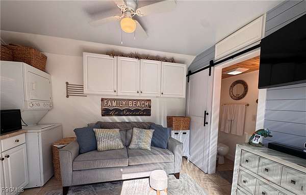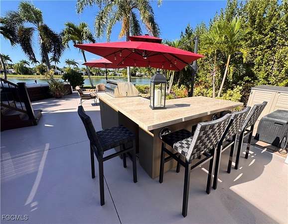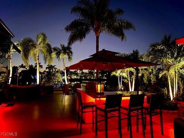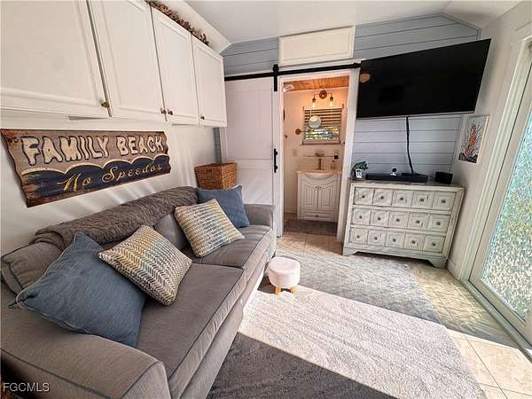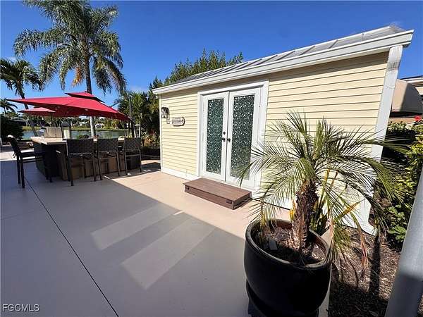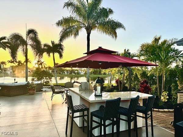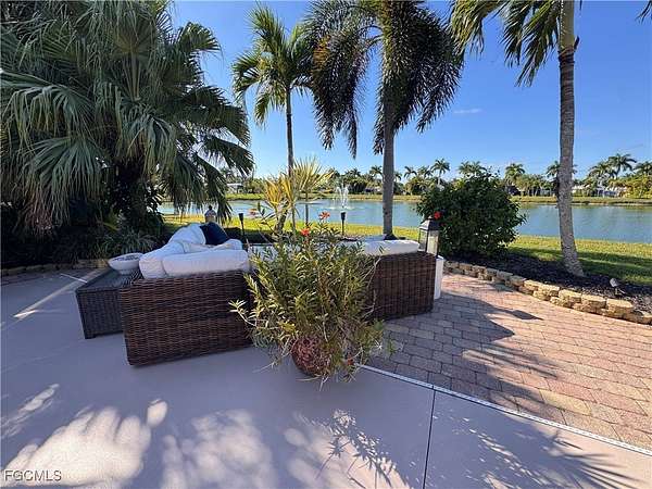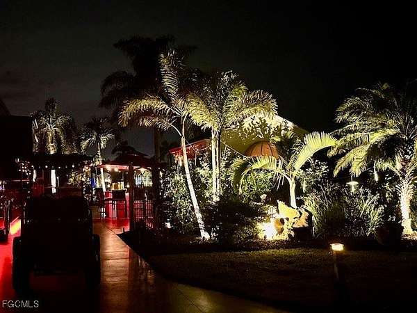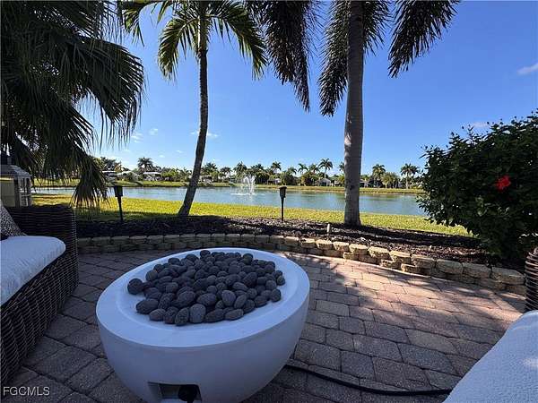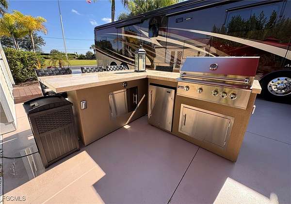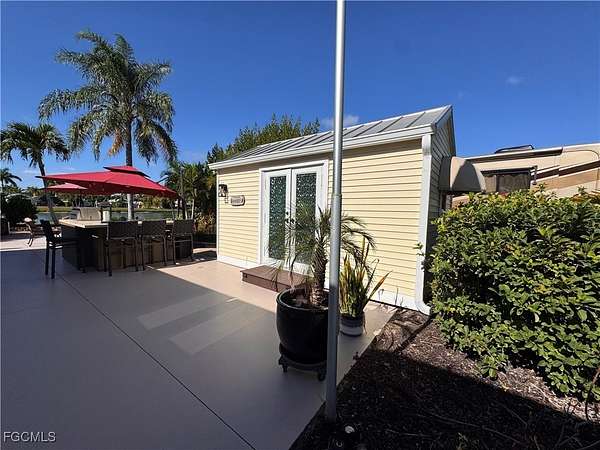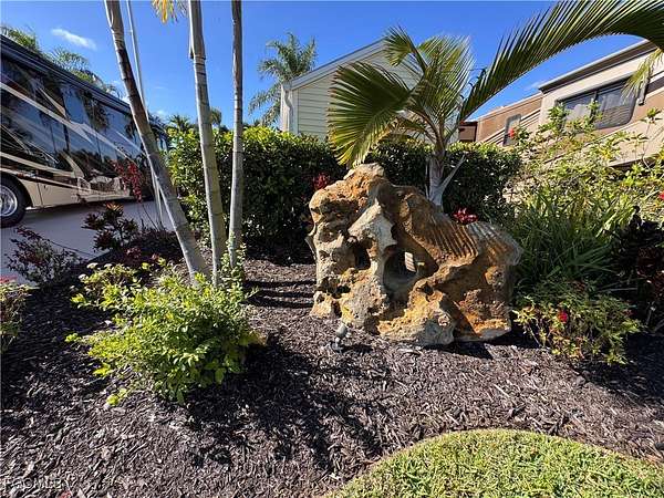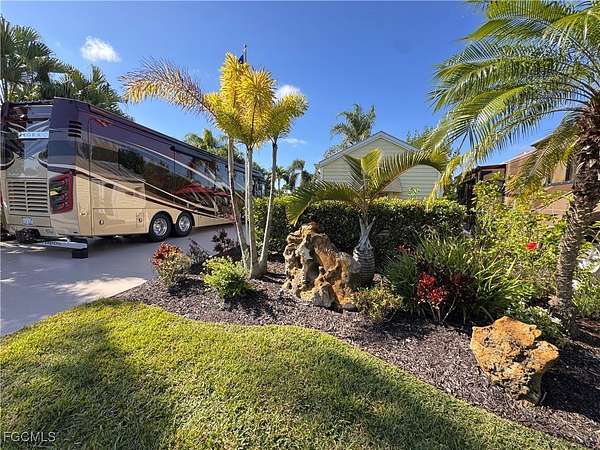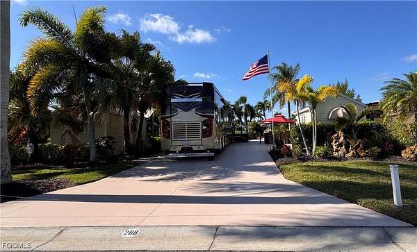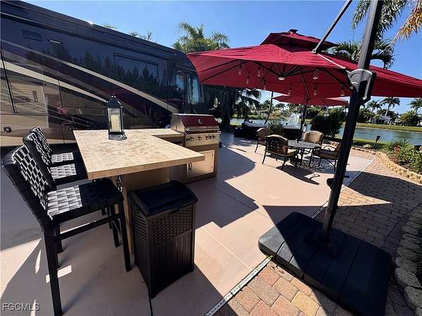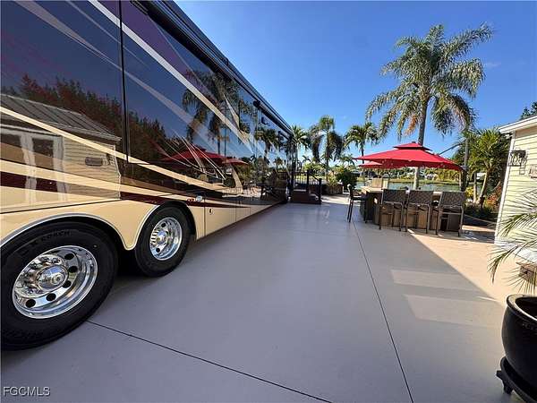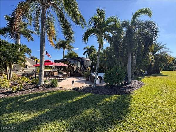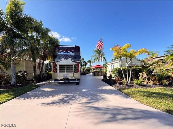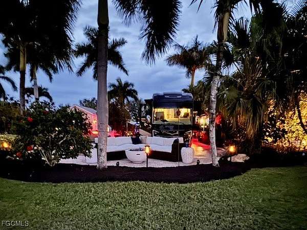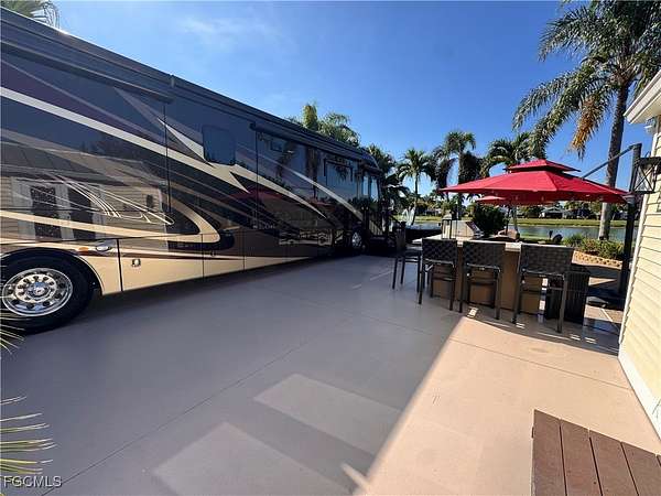 Welcome to a stunning west facing waterfront pull in lot at RiverBend Motorcoach Resort, a property that captivates you the moment you arrive. The dual fountain lake view sets a serene, picture perfect stage, while the pride of ownership is evident in every flourish of landscaping. Updated lush privacy hedging, full irrigation, and warm uplighting create an inviting ambiance day and night, and the generous green space behind the lot brings unmatched tranquility. At the heart of this property is an exceptional outdoor kitchen, a true entertainer's dream. Granite countertops, a flat-top grill, a 24-inch refrigerator, and bar seating with built-in speakers make this the ideal spot to cook, entertain, and unwind. Afternoons drift into evenings as you gather with friends by the water, enjoy golden sunsets, and finish the night beneath a canopy of stars. The coach house is equally charming and practical. Fresh and stylish, it includes tiled floors, a kitchenette, a full bathroom with updated touches, a washer and dryer, and an on-demand water heater. The nearly new queen sleeper sofa lets the space convert easily for guests, while the wall unit keeps everything comfortable throughout the season. Beyond your own private paradise lies the full RiverBend experience. Just steps away, the Caloosahatchee River flows peacefully along the edge of the resort, perfect for morning walks, sunset views, and watching boats drift by as you unwind. RiverBend is known for its beauty, amenities, and vibrant social life. Enjoy the expansive pool with plenty of loungers and shaded umbrellas, or unwind in the bubbling hot tubs. Explore the River Clubhouse with its bar, billiards, library, and regular entertainment like live music, trivia nights, holiday parties, and themed dinners. Stay active with Pickleball, bocce, Zumba, and a large number of clubs and activities including the Creations Guild, remote control boating on the lake and remote control race track, line dancing, and the ever popular Texas Hold Em games. Even your furry friends have their own space at the well-kept dog park. And when you'd rather take a night off from cooking, check the resort calendar, the River Clubhouse often serves refreshments, breakfast, and dinner. This exceptional waterfront lot blends beauty, convenience, and the best of luxury Class A motorcoach RV living, the perfect place to call home within the one of a kind RiverBend lifestyle. Outdoor furniture can be negotiated, but is not included.