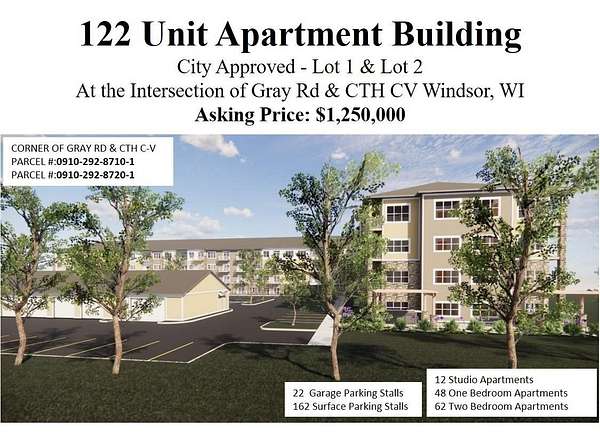 Take advantage of this ready-to-develop investment opportunity in Windsor, WI. This 9.883-acre property is city-approved for a 122-unit multi-family complex, boasting a strategic location at the intersection of Gray Rd & CTH CV. The proposed development includes 12 studios, 48 one-bedroom, and 62 two-bedroom apartments across a 4-story building. With 22 garage parking stalls and 162 surface parking spaces, convenience is key for residents. The project has city approval until May 23, 2026 with potential for an extension upon request. Perfectly situated just 7 miles from Madison's East Side, this property offers a blend of suburban tranquility and urban accessibility. * Seller could stay part of the development entity for the approved plans if needed