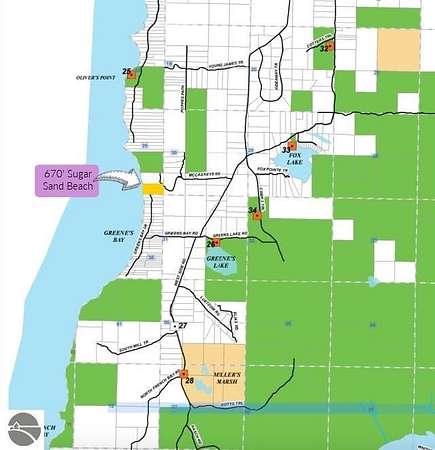 Stunning views of sandy beaches, turquoise waters, rolling dunes, sunsets, and privacy await you at this one of a kind location. This property consists of 670' of sugar sand beach on Lake Michigan with 20.634 wooded acres located at the north end of Greene's Bay.The woodlands are easy to walk with hardwoods amidst a few rolling dunes. This property has improvements of a circle driveway with a cleared building site resting just behind the tree's edge at the lakeside. There is also a well with a holding tank installed near the building site. This parcel is at the very north end of Greene's Bay Dr. which is a private road that has shared maintenance. There are not many more pieces of land like this available on Lake Michigan. This is your chance to create a bit of paradise.