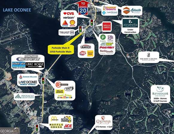 Don't miss out on this opportunity to own a major landmark in the Lake Country and secure a place in Lake Oconee's growth for years to come! Parkside Main 8 Movie Theater is located next to Publix in the rapidly growing Lake Oconee market. Featuring over 50,000 SF on 4.31 acres in Lake Oconee Village, this open and fully operational 8 cinema theater has 915 theater seats over two levels AND all FFE is included in the sale! Continue to operate as a theater, add additional entertainment and food options, or redevelop into one of the many other allowed uses in this flexible mixed-use zoned property. The main level features 36' ceilings in the impressive entry with expansive floor to ceiling windows overlooking the courtyard of Parkside Main. The atrium style entry has the ticketing and concession counter that connects to a full-service kitchen. The kitchen location allows for easy access to the concession counter, the theaters via a pass-through serving area along the hallway while a dumbwaiter provides food access to the second level. The second level, accessible by elevator or open stairs, leads to a full bar with seating, 2 private event rooms and balcony access seating for all 8 theaters. Customer restrooms are located on both floors. This versatile building opens up a world of possibilities. Let your creativity run free as you explore adding additional entertainment options such as Laser-Tag, Bowling, Pickle Ball, or Arcade Games. Expand the menu and utilize the full kitchen to provide a full lunch and dinner service. There are endless options. Located at the entrance of Reynolds Lake Oconee, Lake Oconee Village is a 600-acre master-planned mixed-use development with a variety of shops and professional services in one convenient location. With nearly 100 active businesses, Lake Oconee Village provides a true mixed-use environment offering everything from entertainment and boutique shopping to a wide variety of dining options.