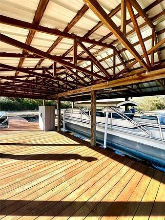 Boathouse features boat lift, tin roof and deck ideal for fishing. The dock also includes steps for easy water access for swimming.