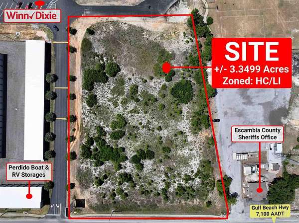 Est $10,317/moThe +/- 3.3499-acre property is located along Gulf Beach Hwy (7,100 AADT), which connects to Perdido Key Dr (23,500 AADT) and Sorrento Rd (19,000 AADT). +/- 358FT of frontage along Gulf Beach Hwy with direct access leading you to Perdido Key. The parcel is zoned HC/LI with strong Grocery Anchored retailers, Winn-Dixie, Ascension Sacred Heart, McDonald's & Dollar General, Publix, Burger King, CVS, Circle K, and many more.