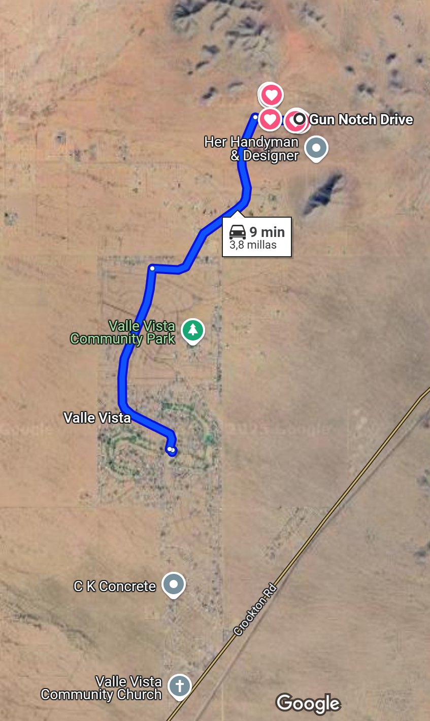 From the Valle Vista Country club continue about ten minutes NNE on Painted Rock Road. Gun Notch is unmarked, on the right-hand side. It is passable by car. The property lies about 1750 feet east of Painted Rock, past the only homesite in the neighborhood.