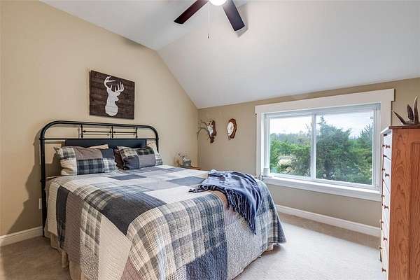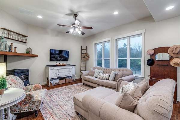 Six acres of tranquility and trees. This property has so much to offer! NO HOA! The heart of this home is the stunning kitchen with upgraded appliances, quartz countertops, designer colors. Coming into the custom hardwood front door off of the front porch, you will find exposed beams and all hardwood flooring on the first floor. Large home office located off of the dining area, cozy pellet stove in the living room heats up this entire home on cold winter days. Step out to the screened in porch to feel like you are miles from home, everyday! Custom barn door leading to the laundry room. Guest home located on property complete with full kitchen, cedar walls and ceiling. Relax by the fire pit on the property. This special property truly feels like home! This property is also available with ten acres. See MLS #21123266. Many possibilities with this property. A wonderful opportunity to build a secondary home on, build a barn or shop. Large custom homes surround this property and it is minutes from The Bridges golf course and country club and the newly built Gunter Elementary school. Unique opportunity to live in a private community in GISD, with no city taxes and a quick commute to Preston Rd. or 75.