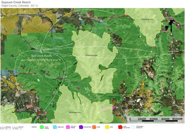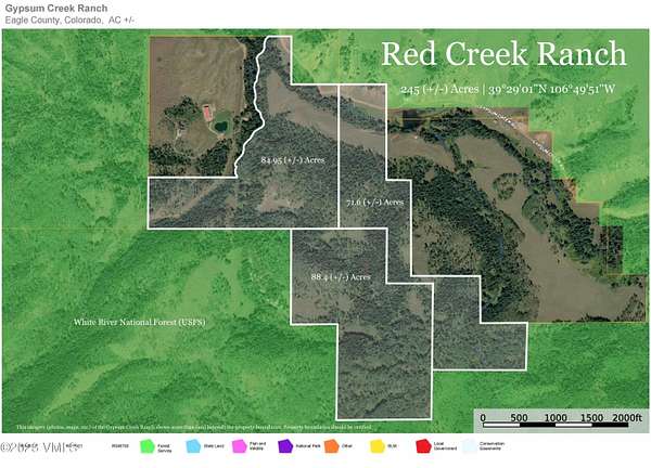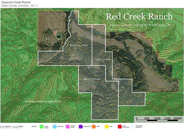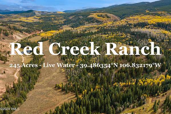 The Red Creek Ranch (RCR) is conveniently located between Colorado's Vail and Aspen ski resorts. The 245 (+/-) acre property borders - is virtually surrounded by - the White River National Forest. 'Live Water' flows through the RCR from Red Creek, Gypsum Creek, and Campbell Creek. The elevation of the ranch ranges from 8,400' to 9,160' and supports a wide range of Colorado's diverse flora [riparian creeks, aspen groves, pine forests, sagebrush hills, to open pastures] and fauna [deer, elk, moose, coyote, fox, and bear]. The property is in Game Management Unit 44 and offers direct access to thousands of acres of hunting and hundreds of miles of approved USFS backcountry roads leading to Ruedi Reservoir. Located 52 miles from Vail, 47 miles from Beaver Creek, 17 miles from the Vail Valley Jet Center, and 80.4 miles from Aspen, the Red Creek Ranch offers privacy, accessibility, and is the ideal Colorado mountain getaway. The gentle topography also offers abundant options to build your dream retreat. A custom interactive map of the Red Creek Ranch and surrounding area is available upon request.