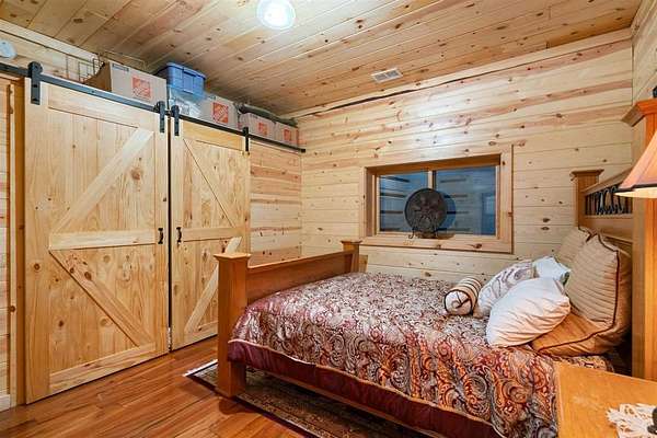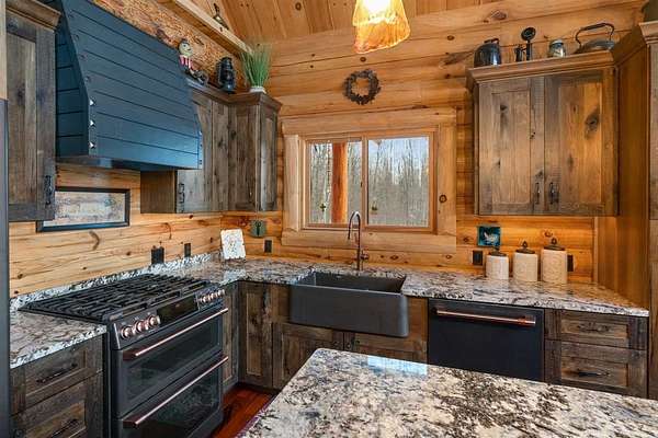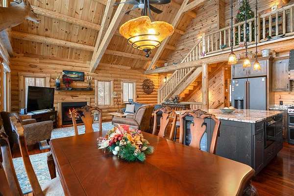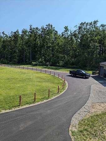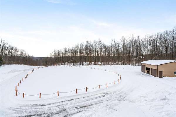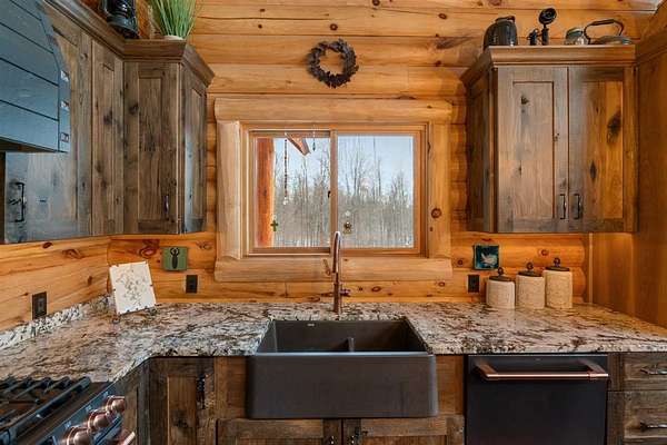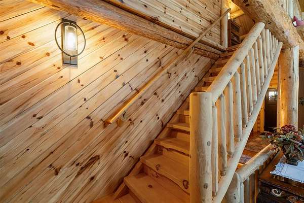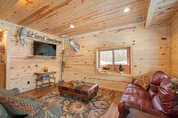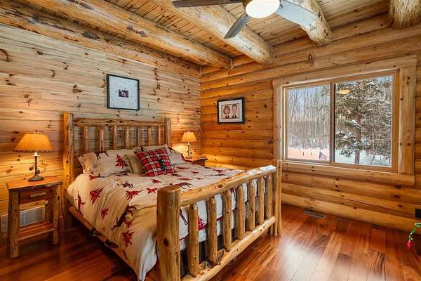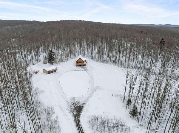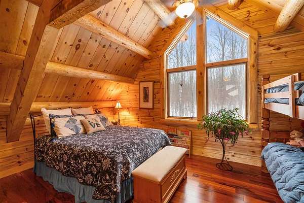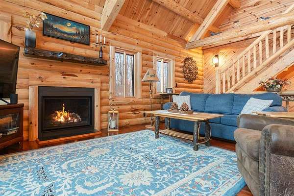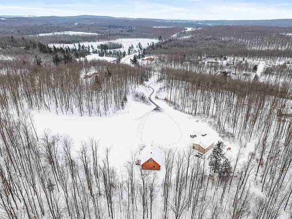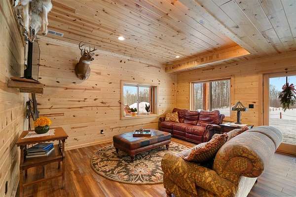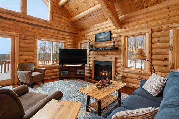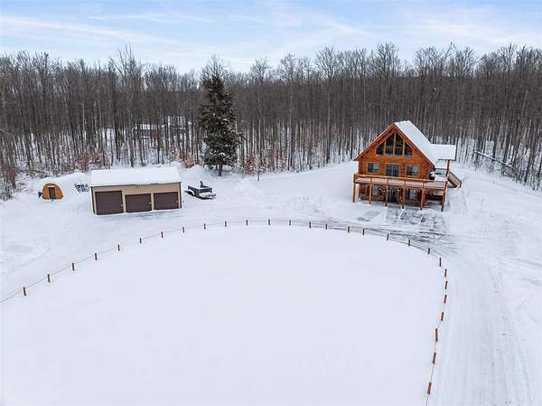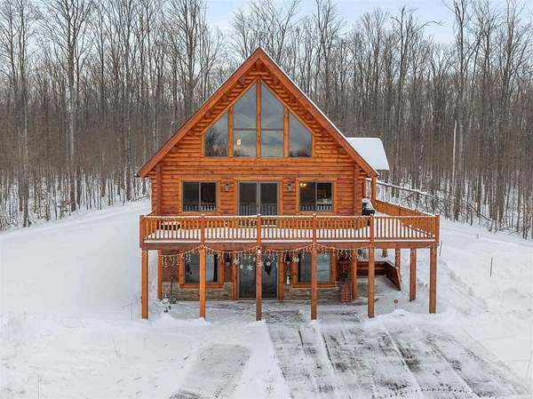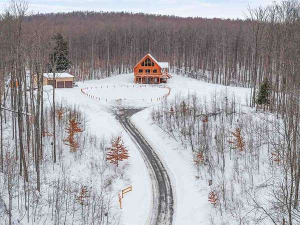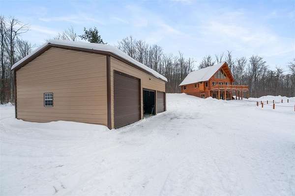 Privately perched 600 feet off the road with a nice lead-in driveway, this beautiful log home, built in 2022, sits on 33.91 acres of wooded Northern Michigan land designed for outdoor enthusiasts. The property features ATV/walking trails, multiple deer blinds, and food plot areas for hunters. With direct access to state land, you'll find endless opportunities for recreation and wildlife observation. The hardwood forest provides natural privacy and four-season beauty. Built with authentic full-log construction, this home showcases exposed-wood interiors and solid-timber craftsmanship. Soaring vaulted ceilings and an open floor plan create dramatic space in the main living areas, while oversized floor-to-ceiling windows capture south-west views of the surrounding area. The kitchen features custom cabinetry, granite surfaces, an island workspace, and modern appliances. The first-floor owner's suite offers main-level living with a generous walk-in closet and a full bath featuring a tiled shower. Two additional sleeping areas occupy the upper and lower levels, with the lower-level walkout offering an ample recreation space perfect for family gatherings. Quality construction includes insulated concrete form foundation walls, CertainTeed Northgate rubber roof shingles, Trex decking, and Andersen Series E energy-efficient windows. Inside, wood floors and authentic log walls create an inviting retreat, with craftsman details throughout and a large gas fireplace anchoring the living space. The separate three-bay, 26 x 38 polebuilding garage with a 10 ft and two 8 ft doors provides storage for vehicles and recreational equipment, with commercial-grade steel door construction and ample clearance for larger trucks or equipment. High-speed fiber optic internet service is available. The property is 2 miles north of Stutsmansville Road, seven miles from downtown Harbor Springs, with ski resorts, golf courses, and Lake Michigan beaches all within a short drive.