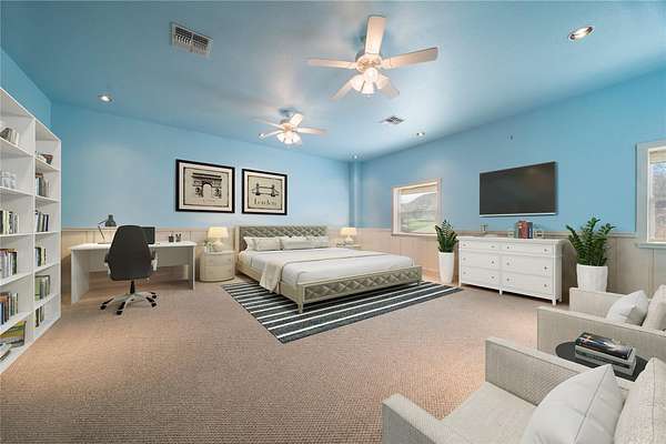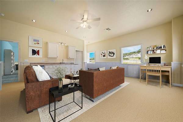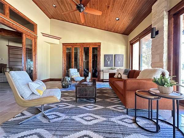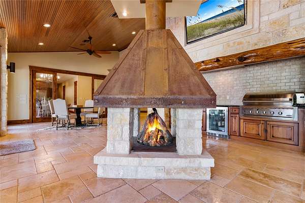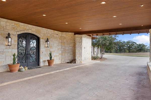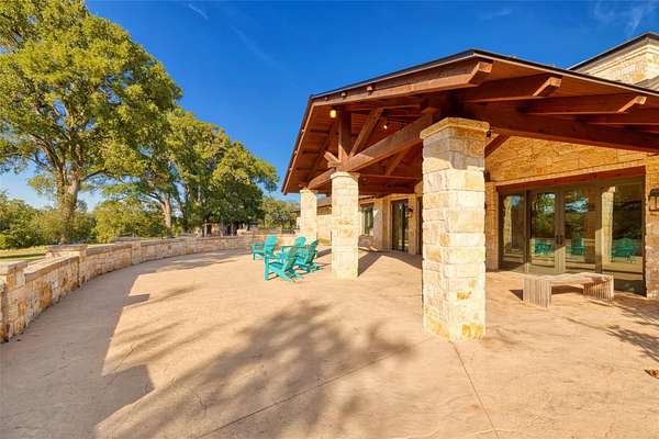 In the Heart of Hill Country, this beautiful Live water ranch offers the best of both worlds by providing a serene country lifestyle without sacrificing modern amenities & conveniences, where you can enjoy water activities such as swimming & kayaking, or simply unwind by the private water's edge, all while having access to high-speed internet, comfortable accommodations, and nearby shopping & dining options. This exquisite 2013 White Rock House is nestled on acres of lush grass, surrounded by tall oak canopies, exotic wildlife, & beautiful creek bluffs, with the added charm of being situated in a tranquil creek bend & enveloped by spring-fed Stevens Creek, supported by a concrete dam that ensures a year-round live creek & abundant wildlife. Unique feature of this home is it's indoor/outdoor firepit living/entertainment room, designed with every season in mind and set to impress. Game House: 1/2bath, a living area, and an area for entertaining with a built-in kegerator, cedar bar top, and plenty of space for games no matter the age. The Game House can be used as a 2nd living quarters, a Mancave/SheShed, teens hangout, &/or late-night games away from the main house. 3rd Improvement: Top-of-the-line 90x74' Steel Barn features; Built-in HVAC 2BED living quarters w/ kitchenette & full bath, commercial grade steel framing, fully insulated, 5 12x10 garage doors, electrical&water. Adds 14 covered parking spots to keep all equipment, RV, & toys protected.Maverick: Clubhouse, Resort Pool, Fire Pits, Green Space, Blue Hole, Sports Courts, Hiking Trails, Overlook, Ranging Exotics, On-Site Groundskeeper, High-Fenced & Gated. Participates in Dark Skies Program for ultimate stargazing experience. 95%Furnished=Convey. SEE VIDEO. OFFERED IN 3 ACREAGE OPTIONS-while available. See agent for more info.