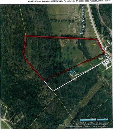 14+ ac located in an ideal rural - country - private location but convenient to approx. 3 miles to Lafayette, TN. Year around creek (East Fork Goose Creek) going through the property (550" of creek), modest restrictions (double wides allowed), loads of wildlife, approx. 7 ac in an open level to a gentle roll cleared fields (more could be cleared) and the remaining in gentle rolling - level mature woodland, approx. 350' of paved State Hwy road frontage, Natural gas well on the property is capped but can be used, utilities available at the road (not installed), some fencing, lovely mountain views, several building sites to select from, ideal horse property and lots of fresh air. Billboard sign at corner of property generates an income of $500 a year - will transfer to the buyers at closing. Buyers will need to develop their own personal access - driveway off Hwy and develop their own bridge across the creek.