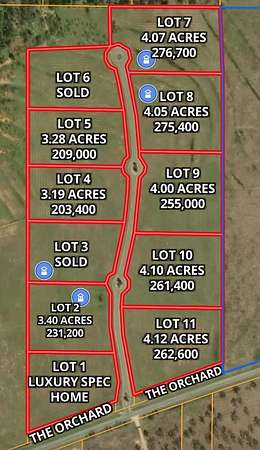 Welcome home to the gated community, The Orchard! Located less than 3 miles from Fredericksburg and set across 44 beautiful acres, The Orchard offers 11 exclusive homesites ranging from 3 to 4 acres. Enjoy the convenience of paved roads with curbs, landscaped medians, underground utilities, and fiber optic internet. Lots 2, 7 & 8 already have wells in place. Reasonable restrictions allow you to choose your own builder, with a minimum of 2,000sf required for a primary residence. Each property also permits one guest house (500-1,000sf) that must match the exterior material of the main home. The HOA maintains the roads, controlled entry with camera access, and landscaping. A discount is available on the lot price with a signed construction contract with GT Builders to build your custom home.