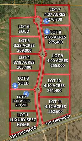 Welcome home to the gated community, The Orchard! Located less than 3 miles from Fredericksburg and set across 44 beautiful acres, The Orchard offers 11 exclusive homesites ranging from 3 to 4 acres. Enjoy the convenience of paved roads with curbs, landscaped medians, underground utilities, and fiber optic internet. Lots 2, 7 & 8 already have wells in place. Reasonable restrictions allow you to choose your own builder, with a minimum of 2,000sf required for a primary residence. Each property also permits one guest house (500-1,000sf) that must match the exterior material of the main home. The HOA maintains the roads, controlled entry with camera access, and landscaping. A discount is available on the lot price with a signed construction contract with GT Builders to build your custom home.