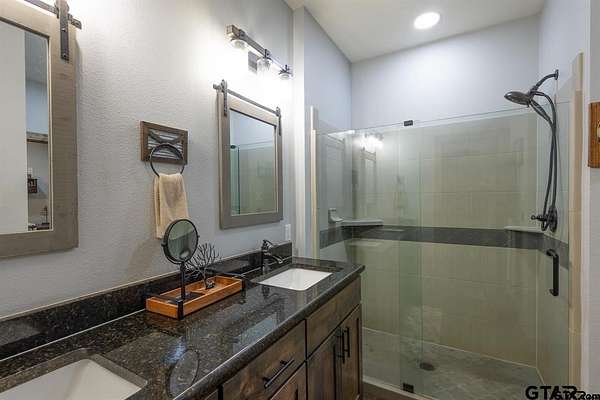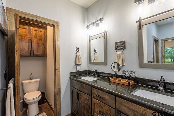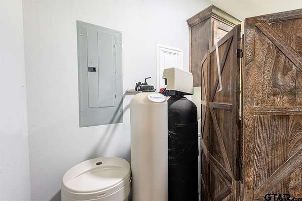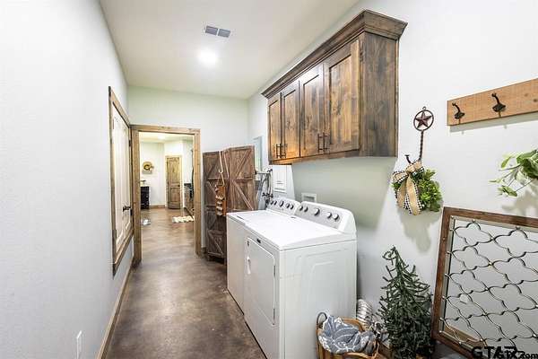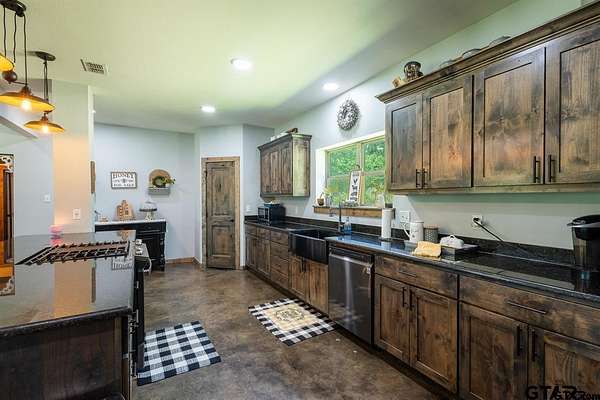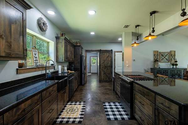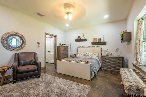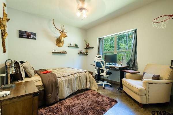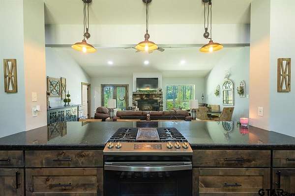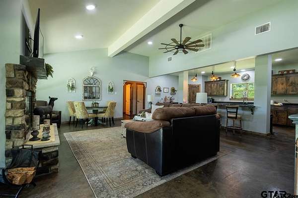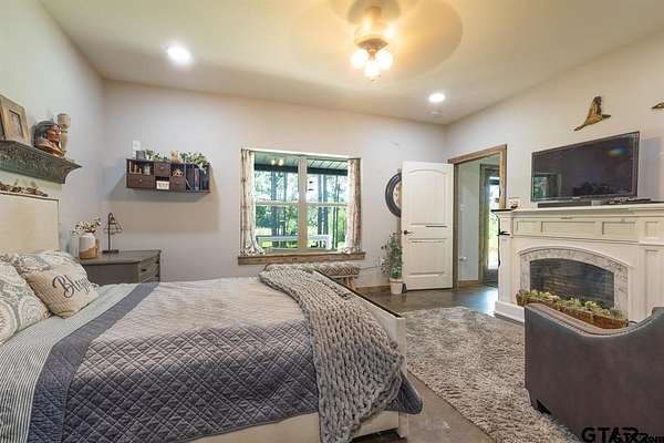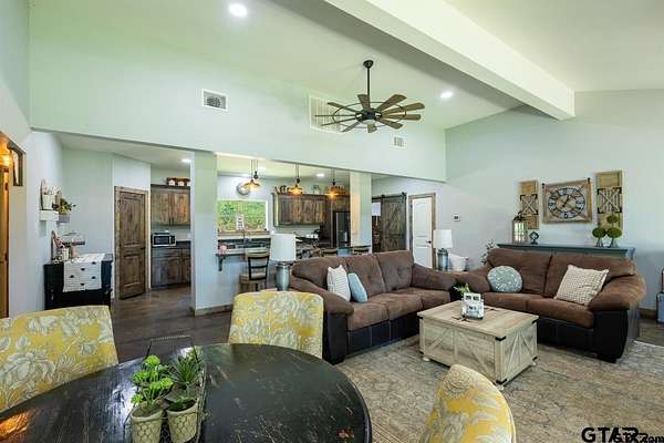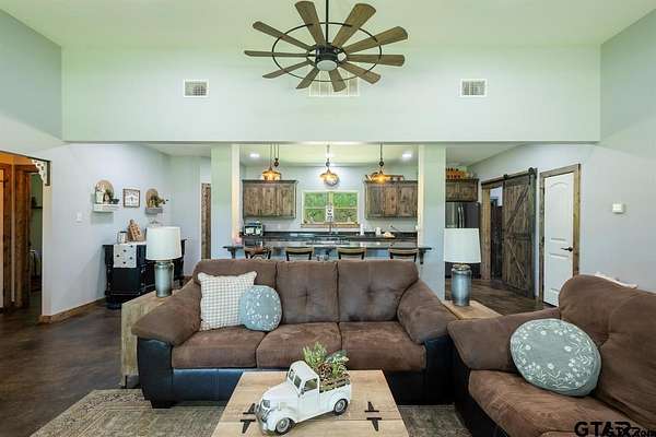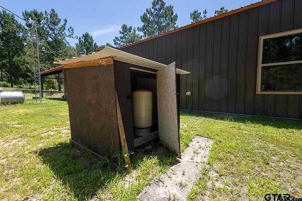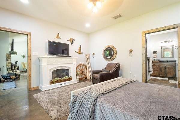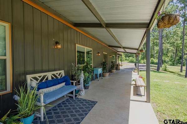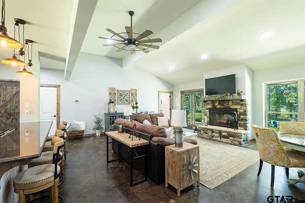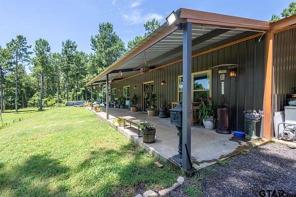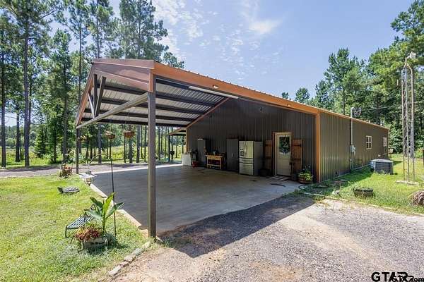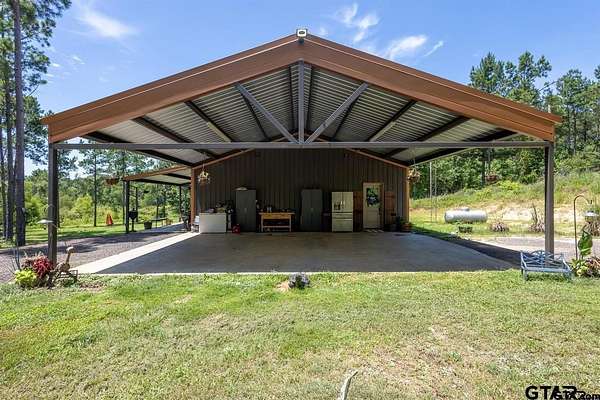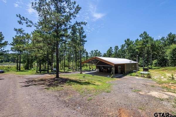 Secluded Barndominium Paradise on Over 52 Wooded Acres with Private Lake Access. THE HOME: This thoughtfully crafted 1,890 sf Barndo seamlessly blends rustic charm with modern comfort. Open-concept living space with vaulted ceilings and magnificent stone wood-burning fireplace as the focal point. Gourmet kitchen features custom wood cabinetry, granite countertops, premium black stainless appliances, gas range, farmhouse sink, walk-in pantry, and oversized island with bar seating perfect for entertaining guests after outdoor adventures. MASTER SUITE: Split bedroom floor plan offers ultimate privacy with master suite featuring sitting area, dual walk-in closets, double vanity, luxurious shower, and private water closet.Two additional bedrooms share well-appointed guest bathroom. OUTDOOR LIVING: Covered porch overlooks your private waters. The property includes access to a beautiful 30-acre private lake abundantly stocked with trophy crappie, catfish, and bass. This secluded private lake offers unparalleled fishing opportunities - your own private honey hole where the fish are always biting! The natural, undisturbed shoreline creates an ideal wildlife habitat and fishery where young fish thrive in protected waters before venturing into the main lake. The 52+ wooded acres provide excellent deer hunting. No fishing licenses required on your own land! ADDITIONAL FEATURES: Newly drilled well with filtration system - Spacious utility room with washer/dryer connections - Over sized attached carport for convenience, gear storage, and future fish cleaning station - Complete privacy on 52.584 wooded acres - Mature plantation pine covers most acreage, with mixed hardwoods near waterfront creating ideal wildlife habitat. This is more than a home - it's a lifestyle. Your own private fishing and hunting resort awaits where every day can be opening day and every cast holds the promise of your personal best!