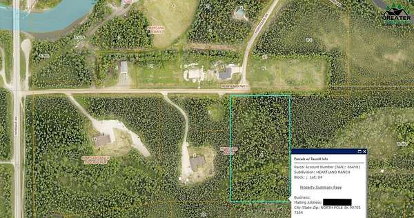Est $556/moBeautifully wooded 5-acre parcel in a great subdivision with some newer homes. You'll find easy access to the Chena River at the Nordale boat launch just a few minutes away. Power is close by and Heartland Avenue offers direct access to the North end of the property. Build your dream home on this private, yet accessible property.