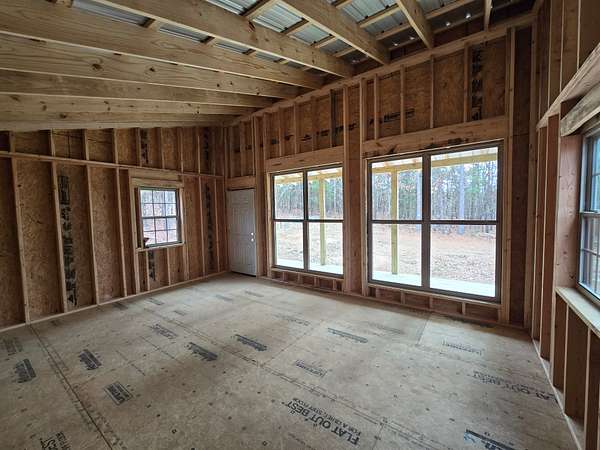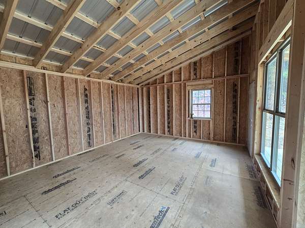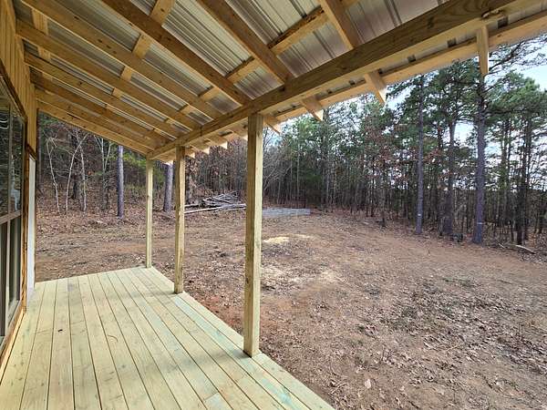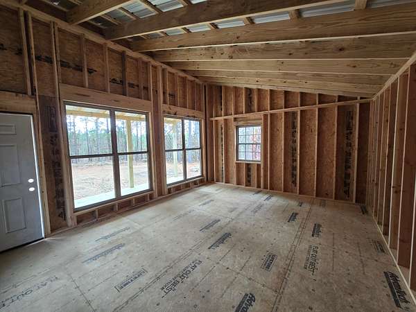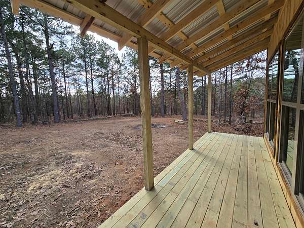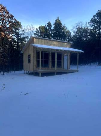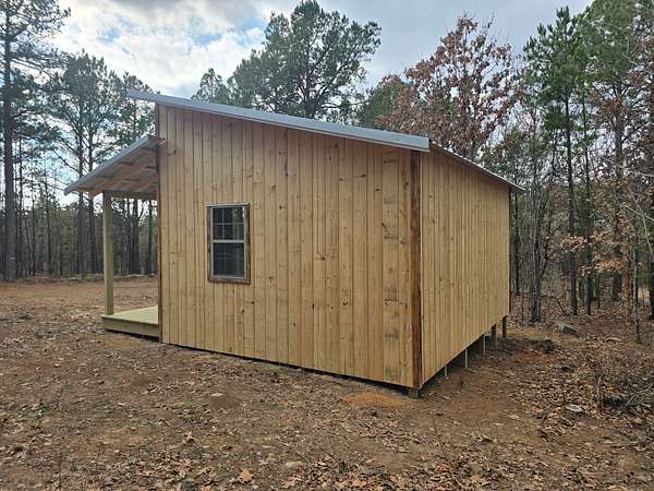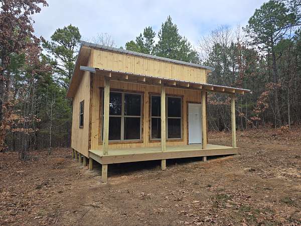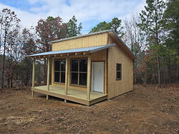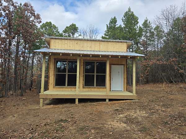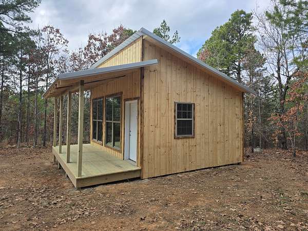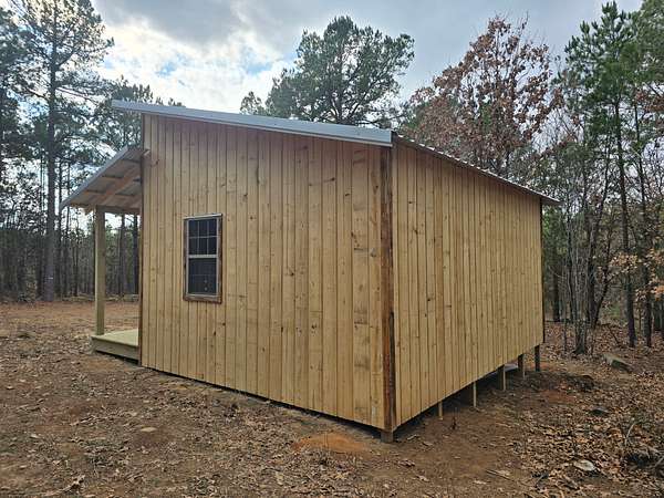 Cabin: There is a newly constructed cabin on the property with a 16 ft x 20 ft main living area and a 6 ft x 20 ft covered front porch. The cabin sits on a cleared and levelled pad, has a post and beam foundation, metal roofing and rustic rough cut 1 x 10 pine lap and gap exterior finish. The cabin is currently a shell and not finished out on the inside. There are (2) 6 ft x 7 ft windows, (2) 3 ft x