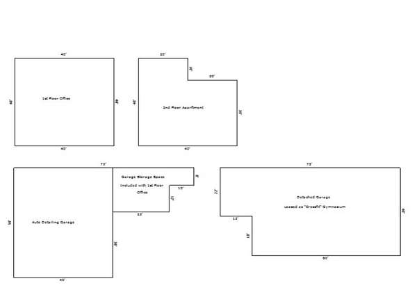 The first floor of the primary building is improved for office use and includes an open work area, five private offices, and restroom facilities. The second floor consists of a residential apartment with a living room, kitchen, dining area, enclosed patio, bathroom, and two bedrooms. The lower level includes approximately 2,000 square feet dedicated to automotive detailing operations, as well as additional garage and storage space.