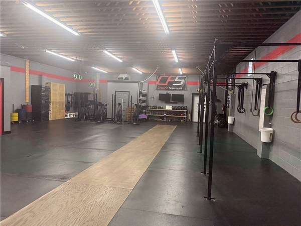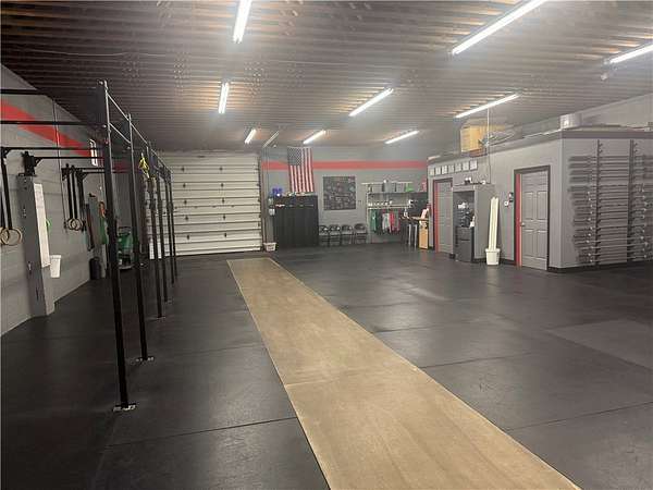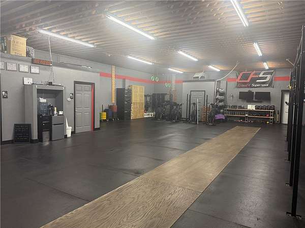 The secondary structure is a detached, one story commercial garage containing approximately 2,686 square feet, constructed of concrete block with a flat roof. The building is configured as open commercial space with restroom facilities and an attached storage area. Both buildings are serviced by separate electrical systems and oil fired forced air heating.