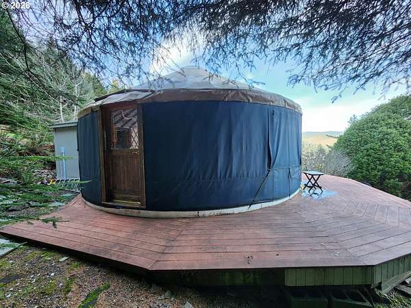 Tucked away on 2.09 private acres, this unique property offers sweeping views of the Elk River Valley and a peaceful, secluded setting. The thoughtfully designed yurt features a full bathroom with tub and shower, creating a comfortable and functional living space. Utilities are already in place with water, septic, and electric installed. Step outside to enjoy a large wraparound deck, perfect for taking in the scenery or entertaining guests, along with a firepit for cozy evenings under the stars. The land boasts a spacious front lawn, a circular driveway, and a small Orchard with mature fruit trees. Exceptionally private with open views and usable acreage, this property offers a rare blend of tranquility, charm, and readiness for immediate enjoyment.