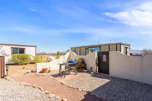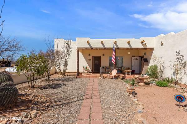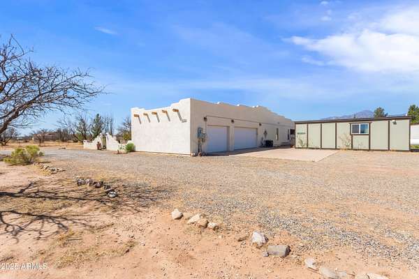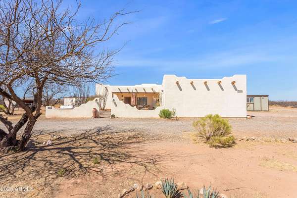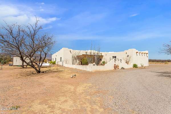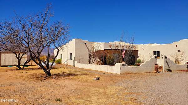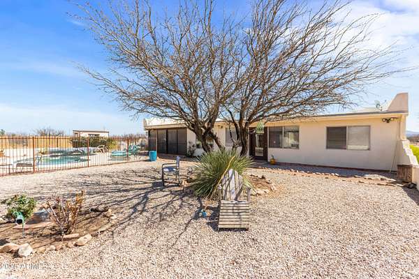 VIEWS! PRICE REDUCTION. This west facing beautiful 3 b 2 b w/ separate casita sits on 4+ acres. It boasts stunning 360 views and a POOL! The Master ensuite provides plenty of privacy. Roll out of bed, drink coffee, exercise, or ease into your morning from the master lanai. The pool is steps away. The backyard entertaining area has plenty of space to host those get togethers under the perfect southern AZ nights. Plenty of room in the garage for motorcycles, golf carts, multiple vehicles, and storage! The separate 392 casita was remodeled in 2024. It features tankless hot water, mini split, kitchen and full bath. Have horses? There is a 10X16 loafing shed w/ water & electric, 10x12 tack room, fenced & cross fenced, 8x10 garden shed w/ power. Sante Fe territorial home has it all. MUST SEE