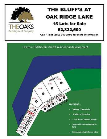 Home sites for sale in the prestigious Bluffs at Oak Ridge Lake developed by the Oaks Development Company. Lots starting at $95,000, total purchase price for all 15 lots $2,832,500. Ten premium waterfront lots ranging from 1/2 to 2 1/2 acres plus 5 premium lots across the street from the waterfront. Waterfront lots include private access to Lawton's largest lake featuring 30 acres of water, 2 miles of shoreline, 3 oak tree covered islands and a sunken firepit on the central island. Oak Ridge Lake is the largest lake in the city of Lawton. The bluffs are surrounded by premium rolling meadows surrounded by award-winning black bison. All home sites offer stunning water, mountain, and nature views. This quiet and private setting is inside the city limits with city streets, lights, utilities and services. It is within minutes of hospitals, shopping, restaurants and more. Nothing else in Southwest Oklahoma compares. This is a great investment opportunity for someone looking for turn key lots ready to build high-end custom homes. For more information call or text Whitney at (580) 917-2706.