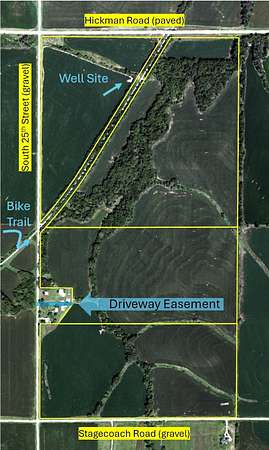 Here's your chance to own a high quality farm with great hunting potential within 20 minute drive from downtown Lincoln, NE. This property is located in Hickman, NE and consists of 309 +/- acres, of which 254 are tillable acres. The soil on this farm scores a 65 on the NCCPI scale and is open for the 2026 growing season. The farm has produced steady income from both the ag ground and the hunting lease. Being 2 miles straight west of Hickman, NE on a paved road, gives this property fabulous development potential. A test well has already been drilled. This tract sits in the popular Norris School District. The Homestead Trail runs through this property and is surrounded by hardwood timber. Also running through the property is a hardwood filled creek bottom that makes this tract ideal for hunting turkeys and whitetails. This property has a perfect mix of tillable acres, and timber draws with live water for the outdoor enthusiast, hunter or someone looking for an investment. There is a lot of deer and turkey sign throughout this property. It's hard to find a spot like this only 20 minutes from downtown Lincoln. The northern 230 acres of this tract can be purchased as a separate tract. Please reference the Lancaster 230 for pricing and details. Taxes: $10,276.18