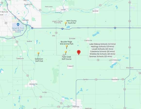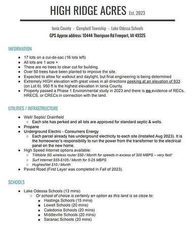 Welcome to High Ridge Acres! A new community on one of Ionia County's highest points with breathtaking sunrise and sunset views. Build your dream home with your own builder! Lots feature underground electric, newly planted trees, and access to high-speed 5G internet. Fences, outbuildings, and chickens allowed. Paved road, low taxes, and Lake Odessa Schools (or nearby Hastings, Lowell, Caledonia, Middleville, Saranac). Just 30 miles to Grand Rapids, 45 minutes to Lansing. Country living with city convenience! GPS: 10444 Thompson Rd, Freeport, MI.