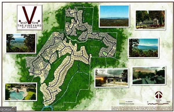 Build your dream home in the heart of North Georgia's wine country! Located in the prestigious Vineyard at Yukon-a 1,500-acre gated community surrounded by nature and luxury-this gently sloped lot offers stunning, long-range mountain views and is perfectly positioned for easy building. The rear of this 1.63 acre lot adjoins community green space for additional breathing room. At 2,600 feet elevation, enjoy cooler temperatures, crisp mountain air, and unforgettable sunrises and sunsets. The community boasts 400 acres of protected green space, fiber internet, paved roads, underground utilities, and future amenities including a mountaintop pavilion and pool. Spend evenings gathered around community fire pits or strolling to the nearby creek for a quiet escape. Minutes from local favorites like Chateau Meichtry Vineyard & Winery and a short drive to Ellijay's charming downtown, this lot combines peaceful seclusion with proximity to wineries, hiking trails, mountain biking, and year-round adventure. Whether you're planning a full-time residence or a weekend retreat, this property is your gateway to mountain living at its finest.