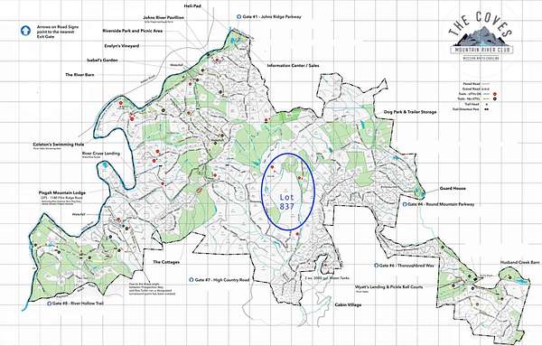 Use the gates on corner of Rocky Rd and Round Mountain Pkwy (address for guard house is 1314 Round Mountain Pkwy). Gate code required. Stay straight and Round Mtn Pkwy becomes Walnut Ridge Dr. Left on Red Cedar. Left on Equestrian Dr, which runs into High Valley Way. Bear right on High Valley Way. In half a mile the lot will be on the left