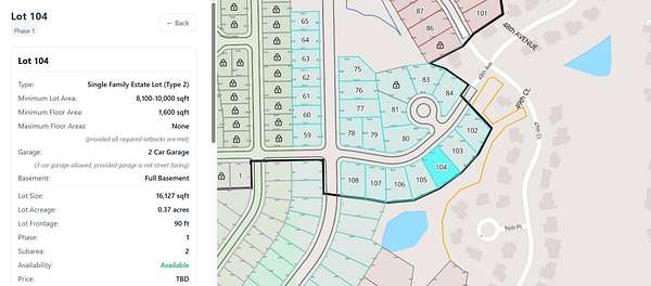 Est $1,785/moWelcome to Highland Estate Development, Pleasant Prairie's most exciting new residentialcommunity! Lot 104 is a generously sized homesite offering over 16,127 square feet andspacious views--an ideal setting to bring your vision to life. Phase 1 is officially underway,giving you the opportunity to bring your own builder or work with one of our trustedpartners. Thoughtfully designed with lifestyle and livability in mind, Highland Estates offersthe perfect blend of community, comfort, and convenience in a prime location. Don't missyour chance to call this exceptional neighborhood home!