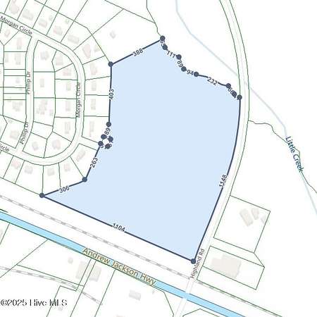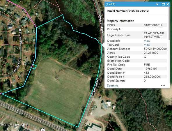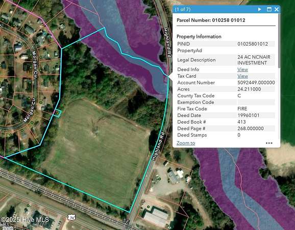 Welcome to an incredible property just outside city limits, where the perfect blend of nature and opportunity awaits. Spanning a generous 23.9 +/- acres, this beautiful tract of land features a serene stream gracefully meandering along its northern boundary, offering a peaceful soundtrack of flowing water and the chance for various recreational activities. Approximately half of the property has been cleared and ready for your new home and the soil is well-suited for agricultural use, presenting an excellent opportunity for farming or gardening. The remaining portion of the property is a lush, wooded area, providing a habitat for local wildlife and a tranquil escape for nature lovers. The trees offer shade and privacy while enhancing the aesthetic appeal of the landscape. This property is a perfect combination of practicality and natural beauty, ideal for those looking to create their own oasis just moments away from the conveniences of city living. Whether you envision a charming homestead, a thriving farm, or a peaceful retreat, this land offers endless possibilities. Notes: The property has a 90 ft. powerline right of way running through it from the southwest to the northeast and a smaller 20 ft. wide by 35 ft. long right of way on the western boundary for access to a county water pump station. Approximately 3.3 acres bordering the stream are in a flood zone. Easily identifiable boundaries exist, with Highland Road serving as the eastern boundary and railroad tracks running along the southern boundary in addition to the stream to the north. Currently Zoned R6 the property has the possibility of being rezoned to I or GB.