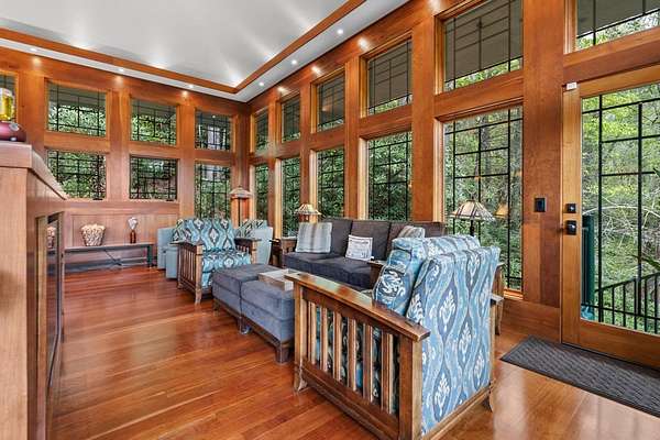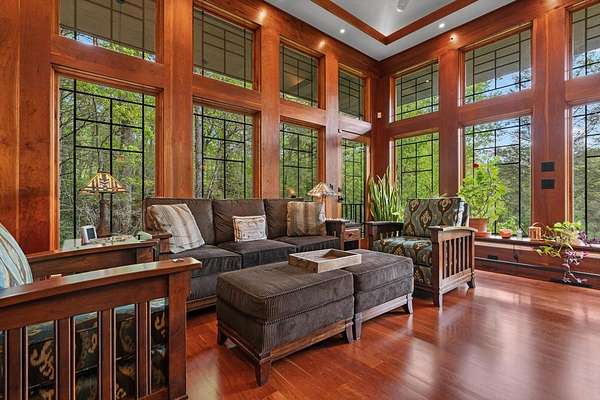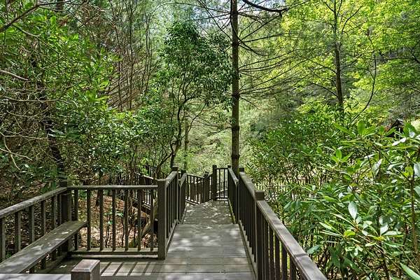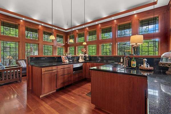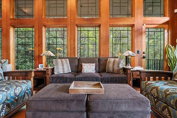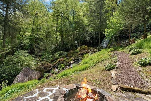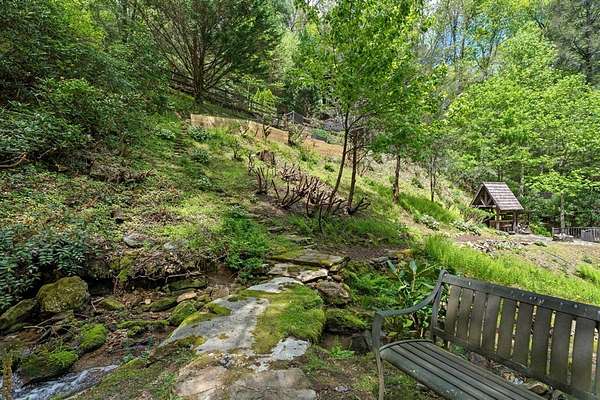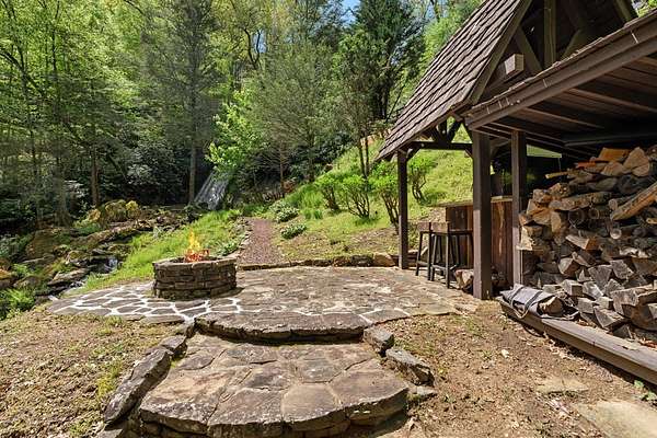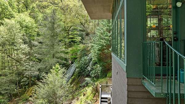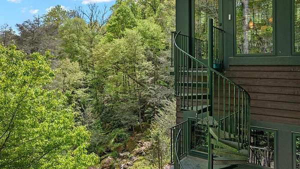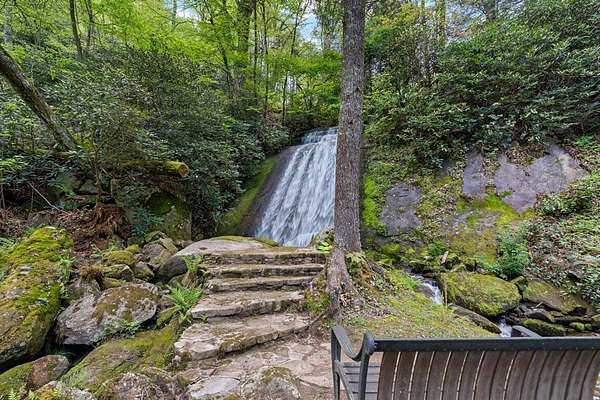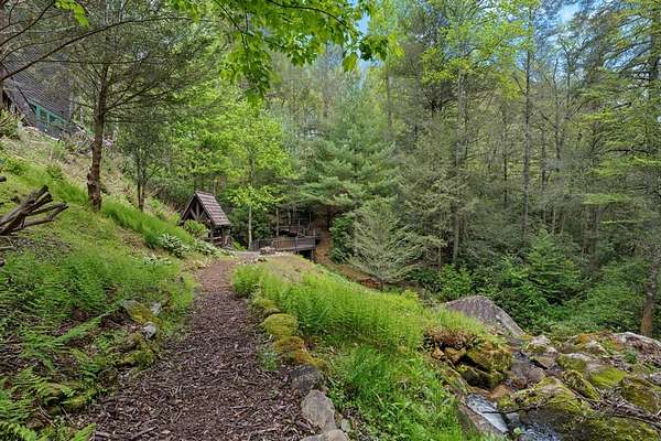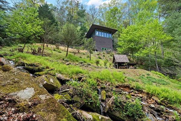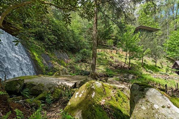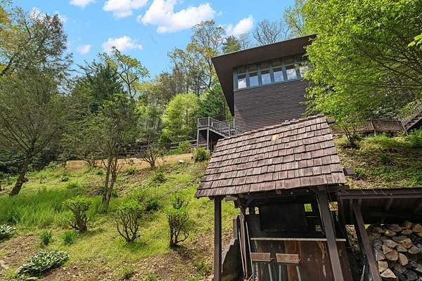 Welcome to "Secret Waters," a name that invites curiosity and promises enchantment. As you arrive, the magnificent tower house rises before you, complemented by the soothing sound of rushing waters. This exceptional residence features two remarkable elements: an architecturally designed tower house and a stunning natural wonder—a waterfall flowing gracefully beneath the home, creating a sanctuary that overlooks nature's spectacle. Every detail of this lavish residence has been meticulously crafted, showcasing exquisite cherry millwork, sleek granite surfaces, and expansive glass walls that offer breathtaking views. Venture outdoors to explore the enchanting grounds, where numerous bridges span the cascading waters, including a swinging bridge and a zip line. The unique site has served as the backdrop for countless weddings and events, generating an impressive social media presence that could lead to exciting opportunities for the savvy entrepreneur. With 5 acres of land available for additional accommodations, including a detached two-car garage, the potential is boundless. This Frank Lloyd Wright-inspired masterpiece is beautifully furnished for immediate luxurious living.