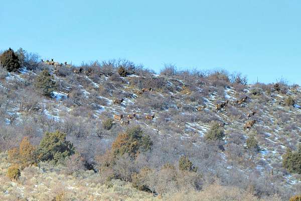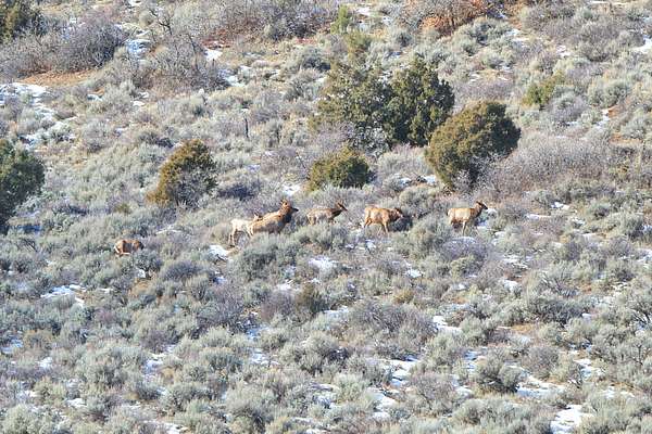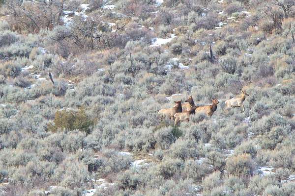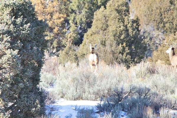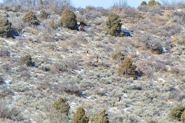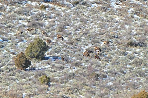 The ranch consists of rolling and gently sloping terrain, with broad sagebrush flats and sub-irrigated bottoms that provide abundant forage for livestock and wildlife. Oakbrush pockets and pinyon-juniper stands along the west and south boundaries create additional cover and habitat diversity. A unique feature of Elkville Ranch is its adjacency to BLM land; a lengthy valley stretches from the property border up the face of the overlooking cliff, containing wallows, feeding and bedding areas, open meadows, and water sources. This natural corridor funnels wildlife directly onto the ranch, attracting elk, deer, and turkey year-round. The limited public access on this BLM land further enhances the privacy and wildlife consistency of the property.